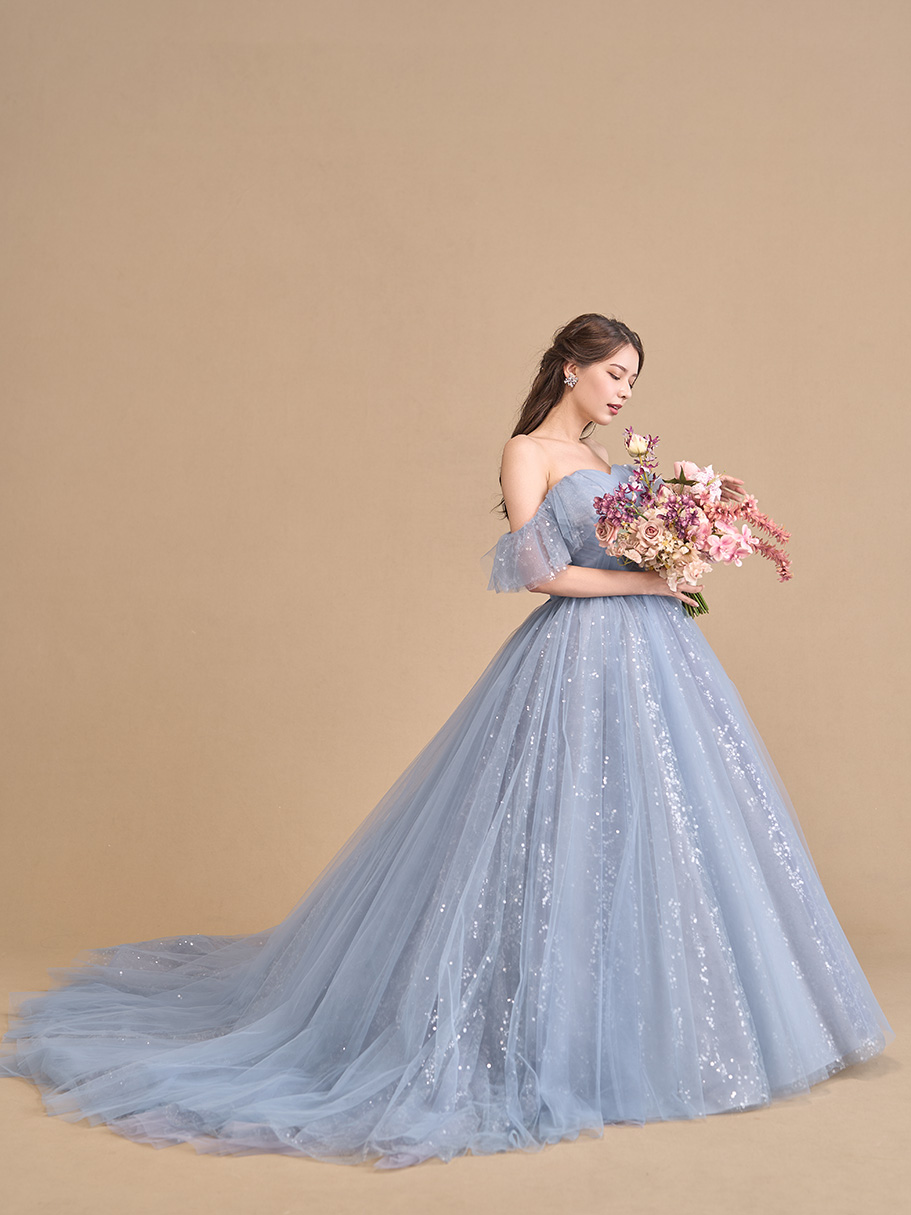 水色のチュールにグレイッシュな色味を重ねて仕上げたボリュームドレス。
