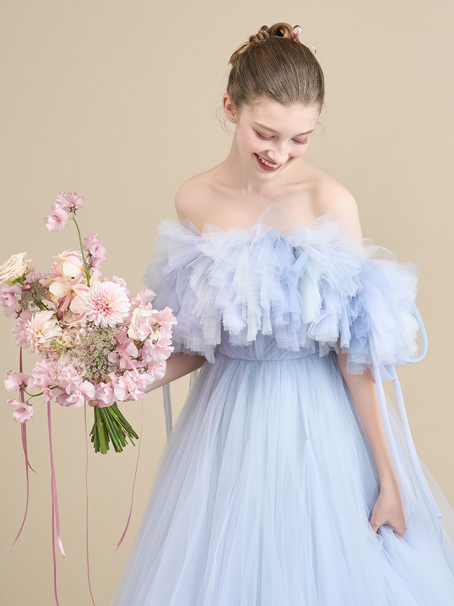柔らかなチュールで仕上げたフリルショールは包まれるような心地良さ。