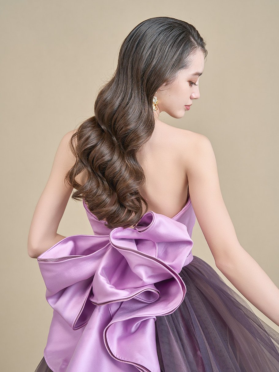 構築的なリボンの意匠が光る印象的なバックスタイルに。