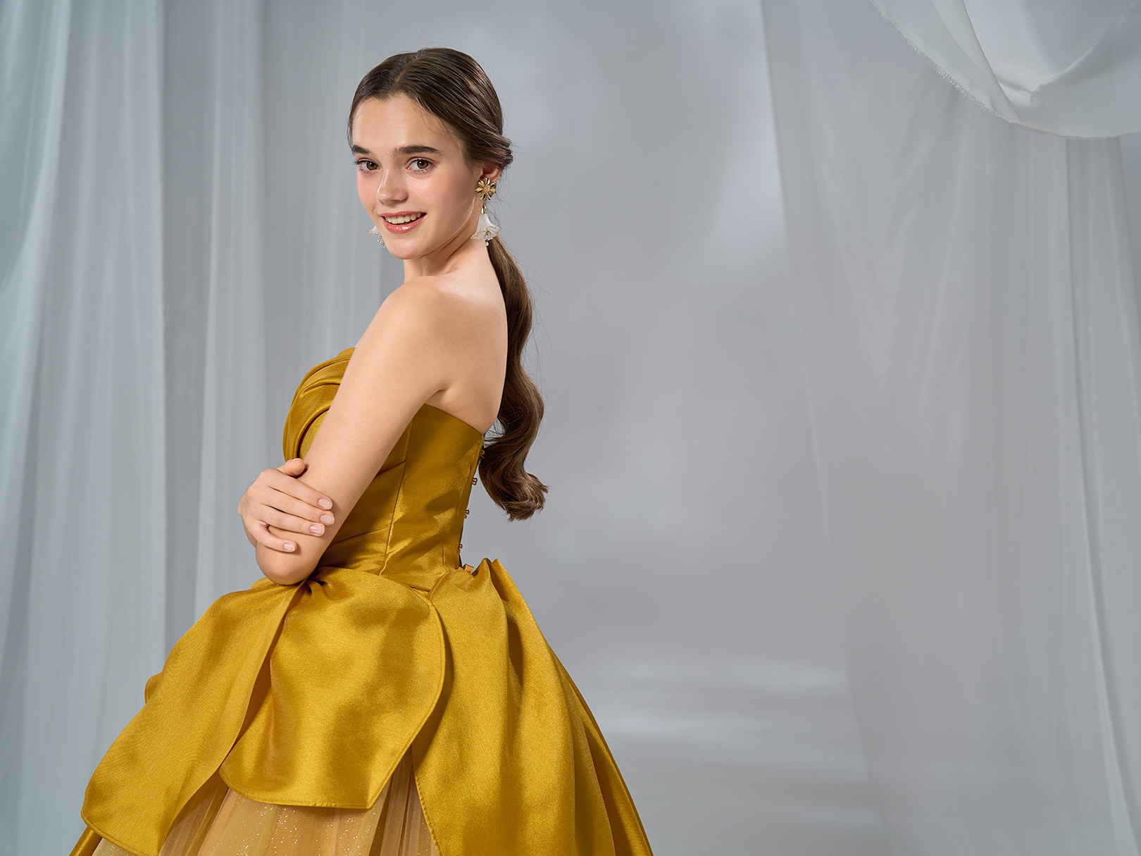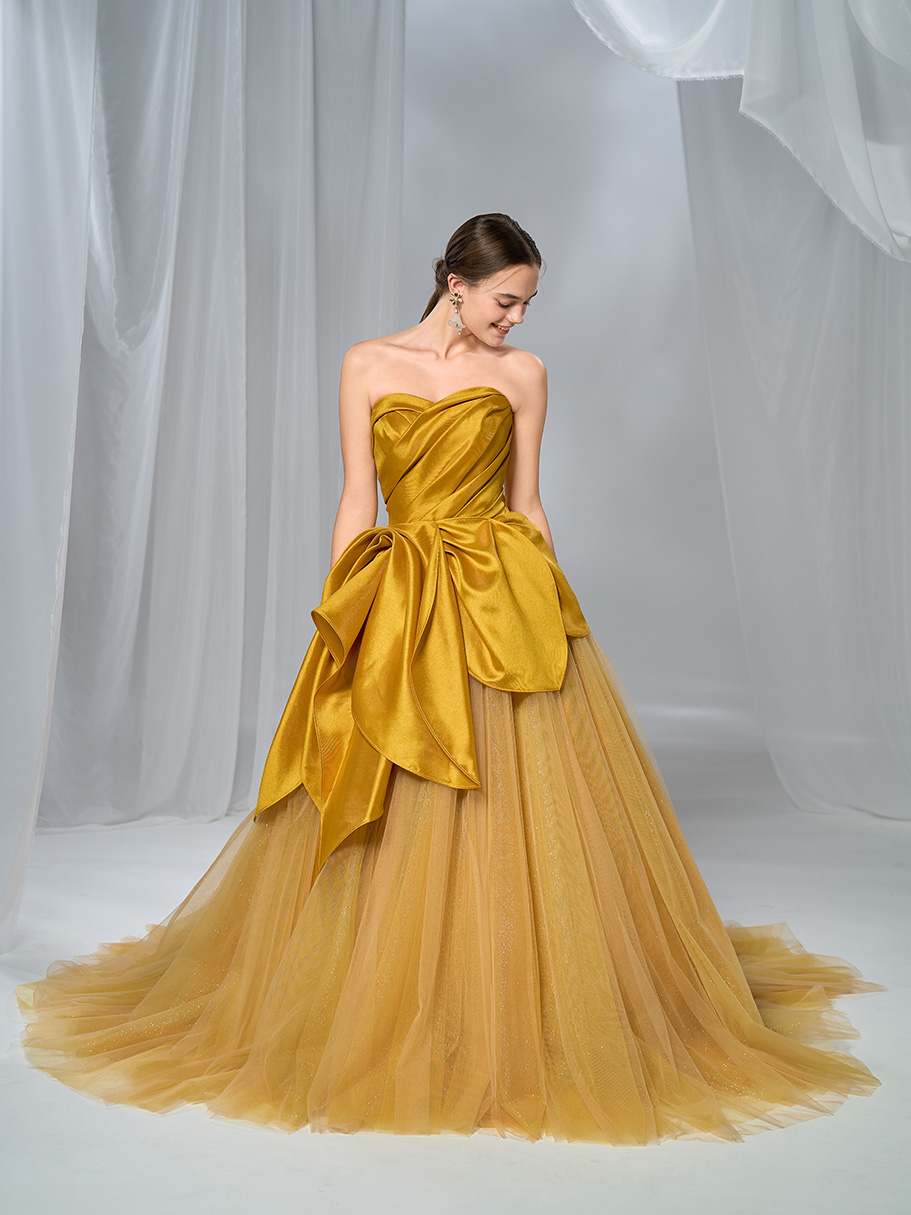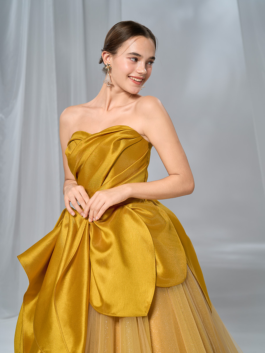 ドレープの美しさとグリッターチュールの輝きが際立つドレス。