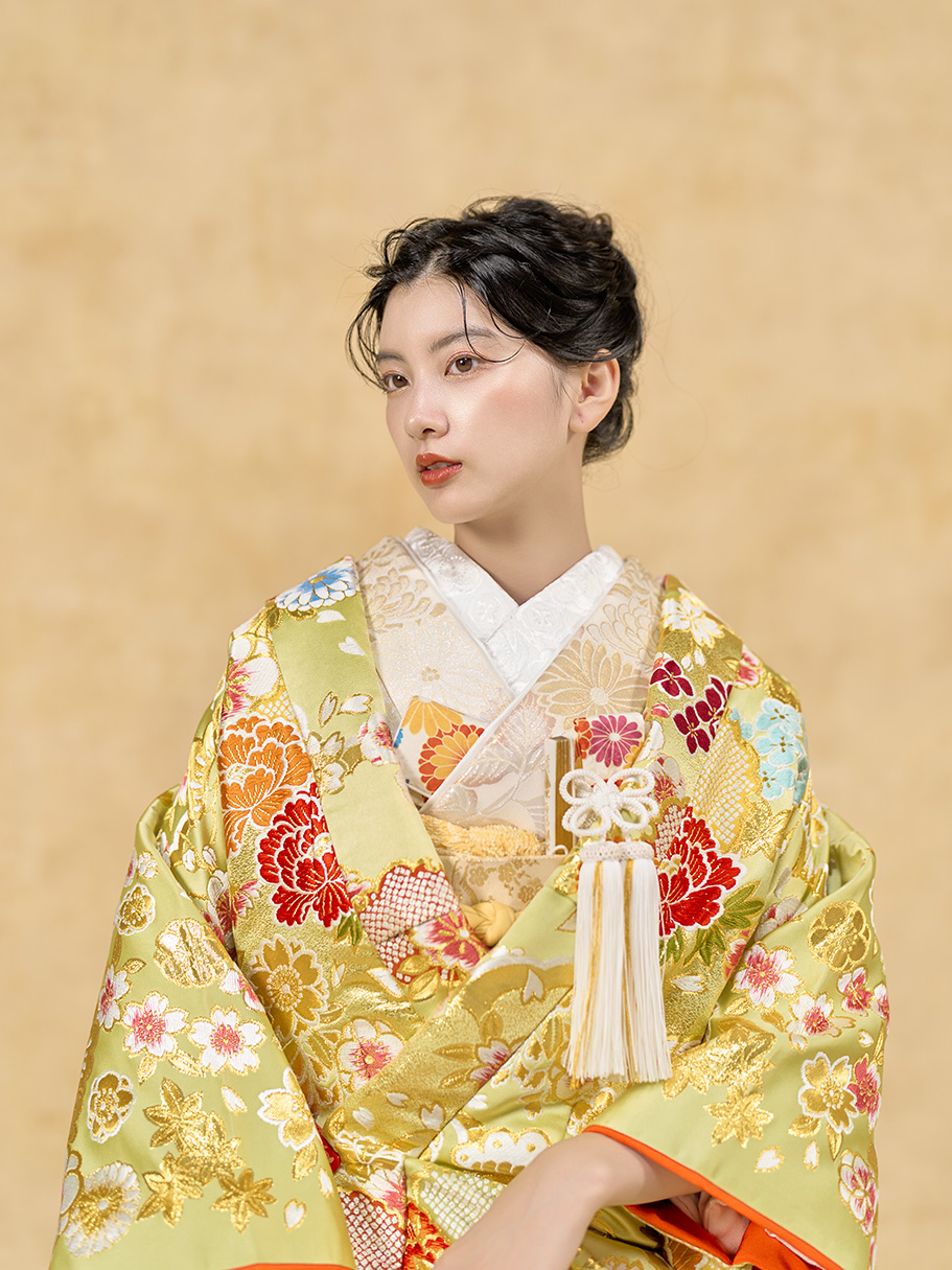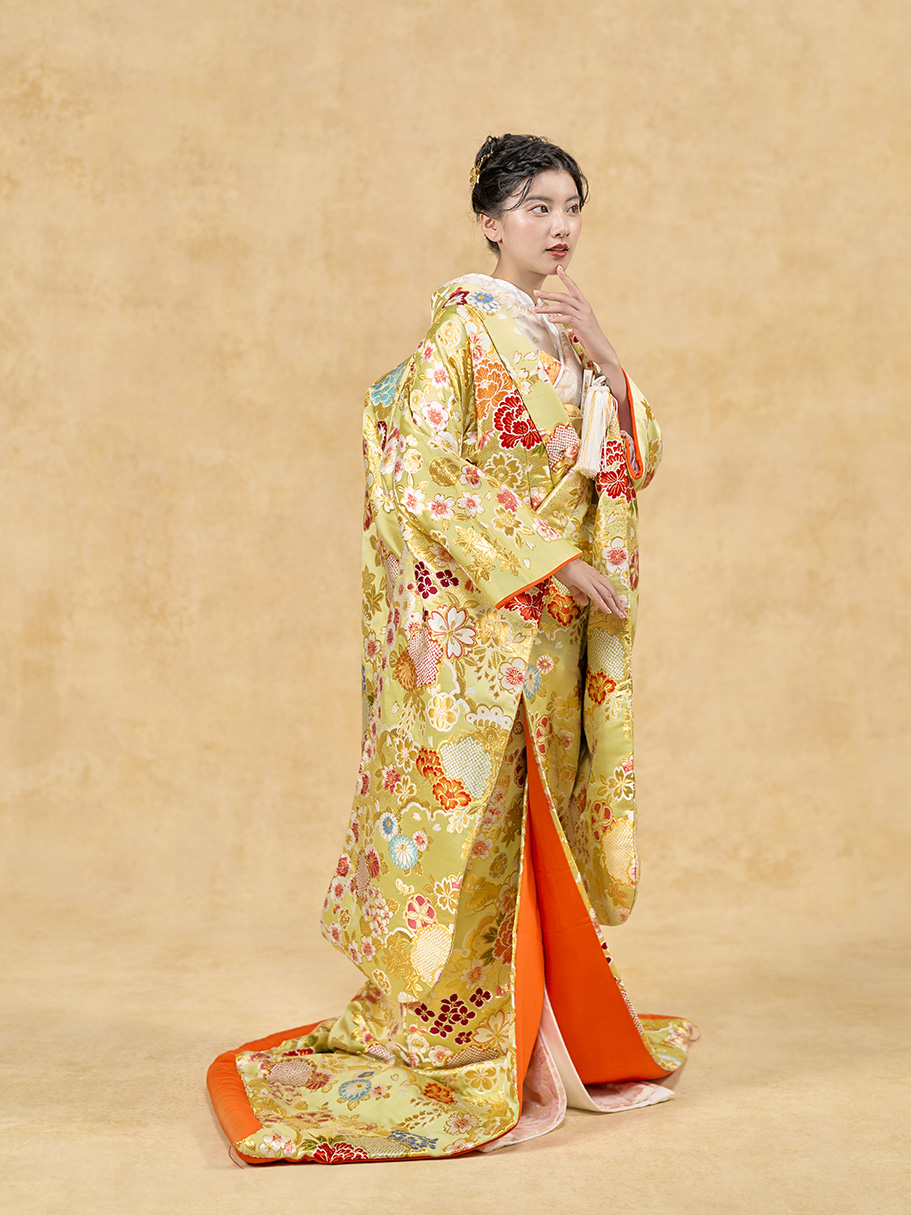 、桜や牡丹、可憐に連なり咲く小花などをあしらった色打掛。