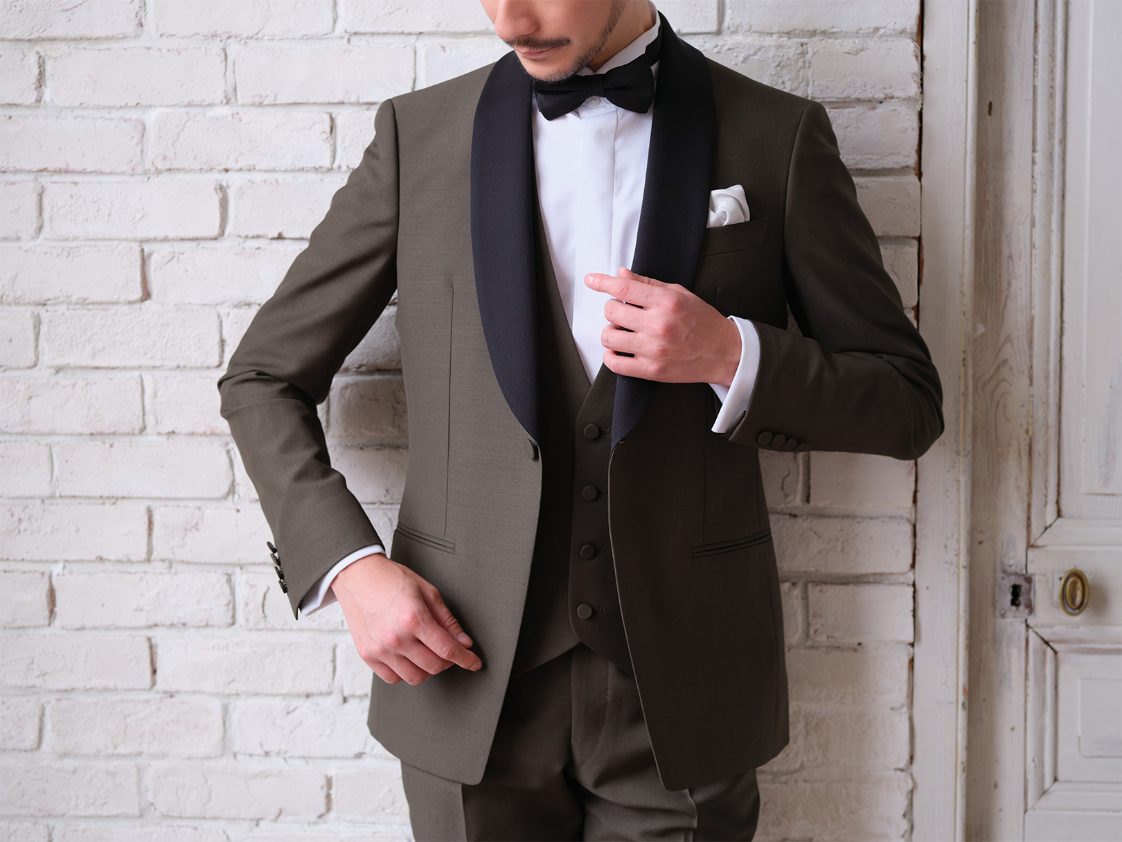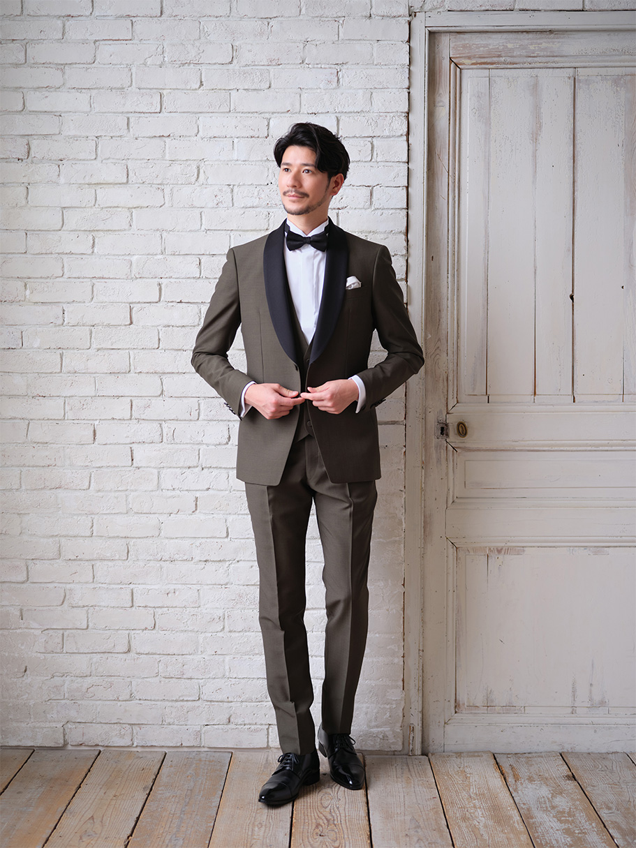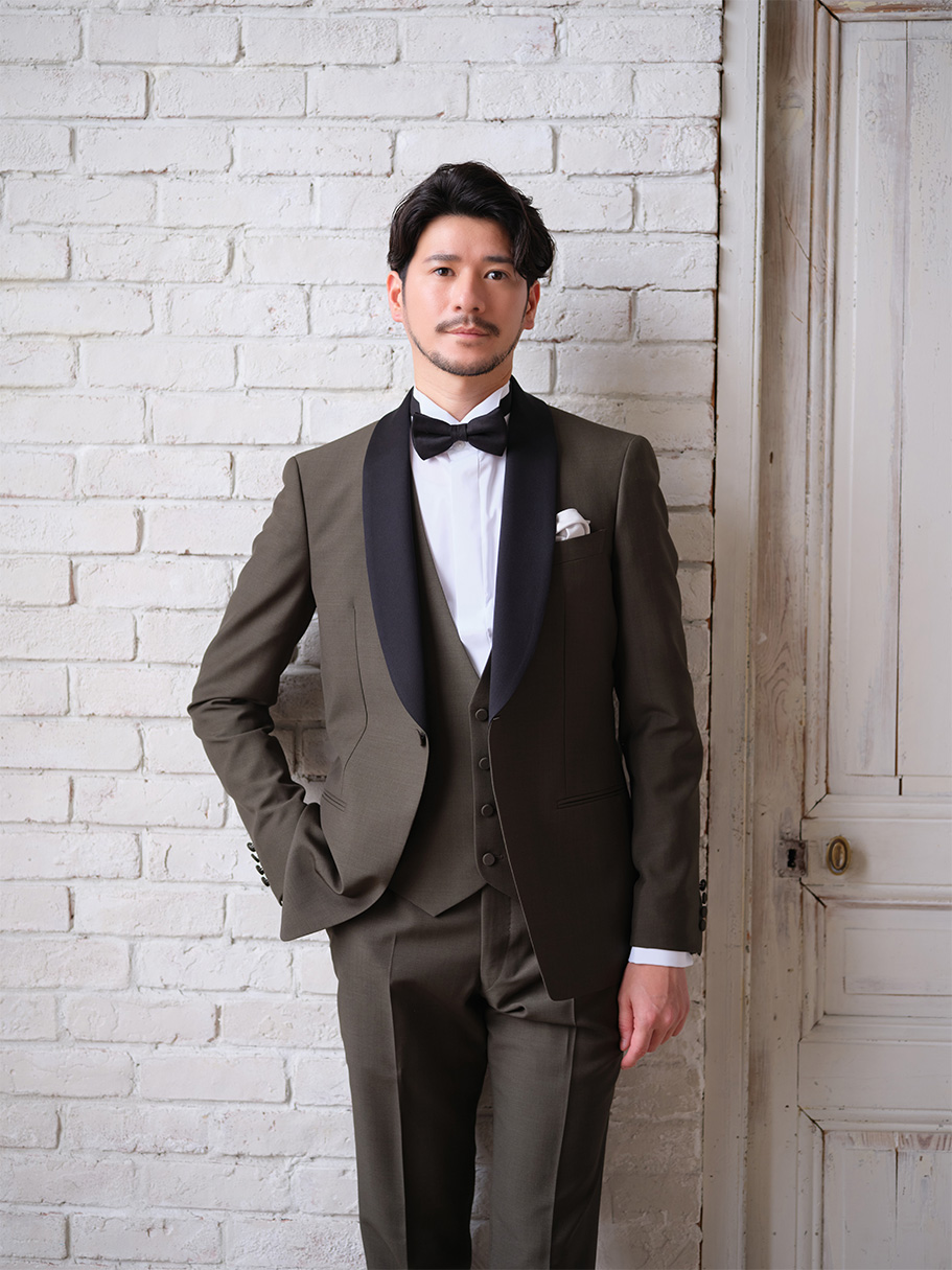 こなれた大人の余裕を感じさせるカーキカラーのタキシード。