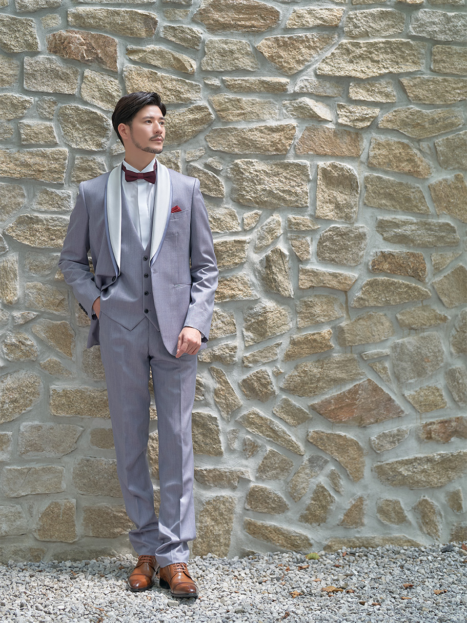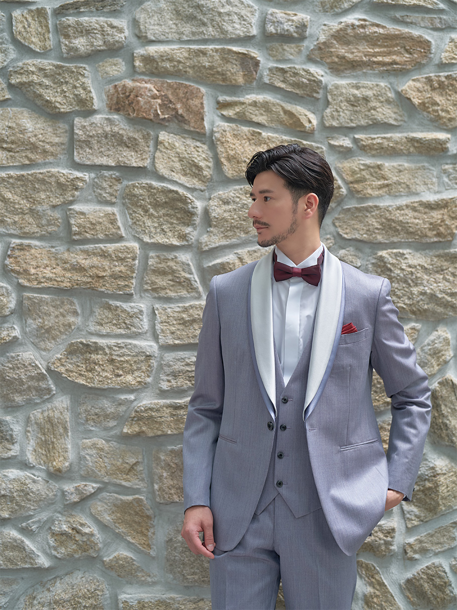 爽やかなサックスブルーのタキシードはラペルのホワイトとタイのレッドをアクセントに