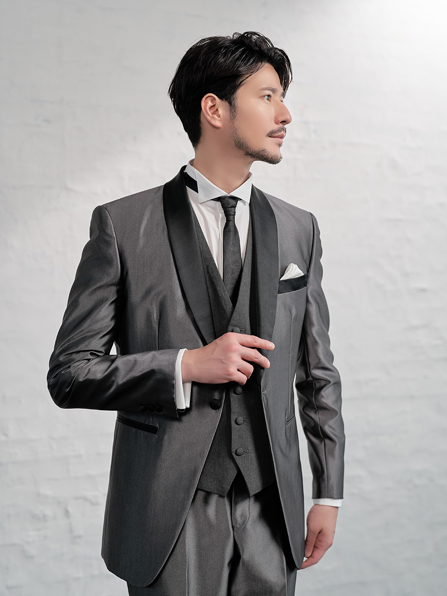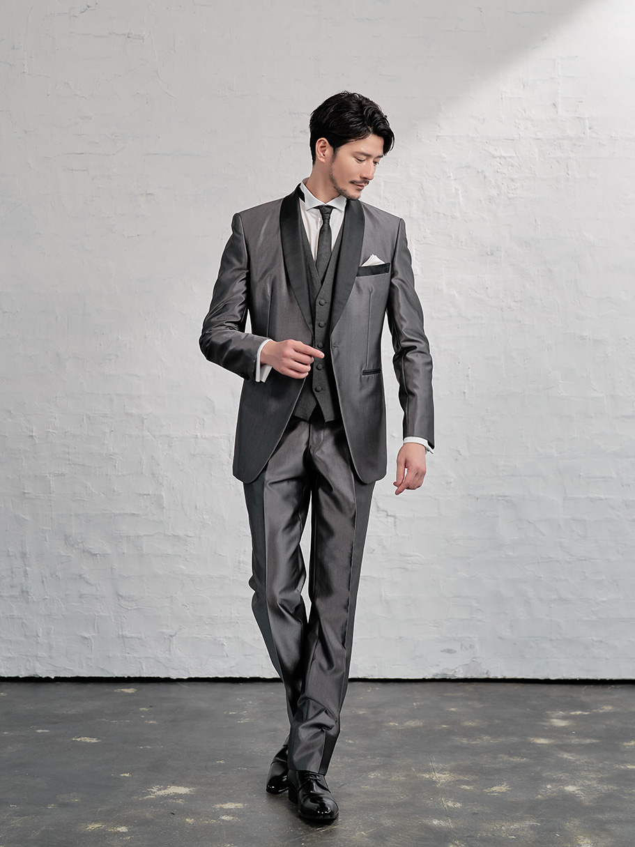 上品な光沢感が印象的なチャコールグレーのタキシード。