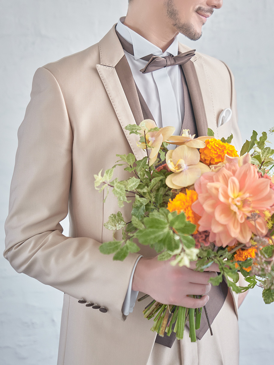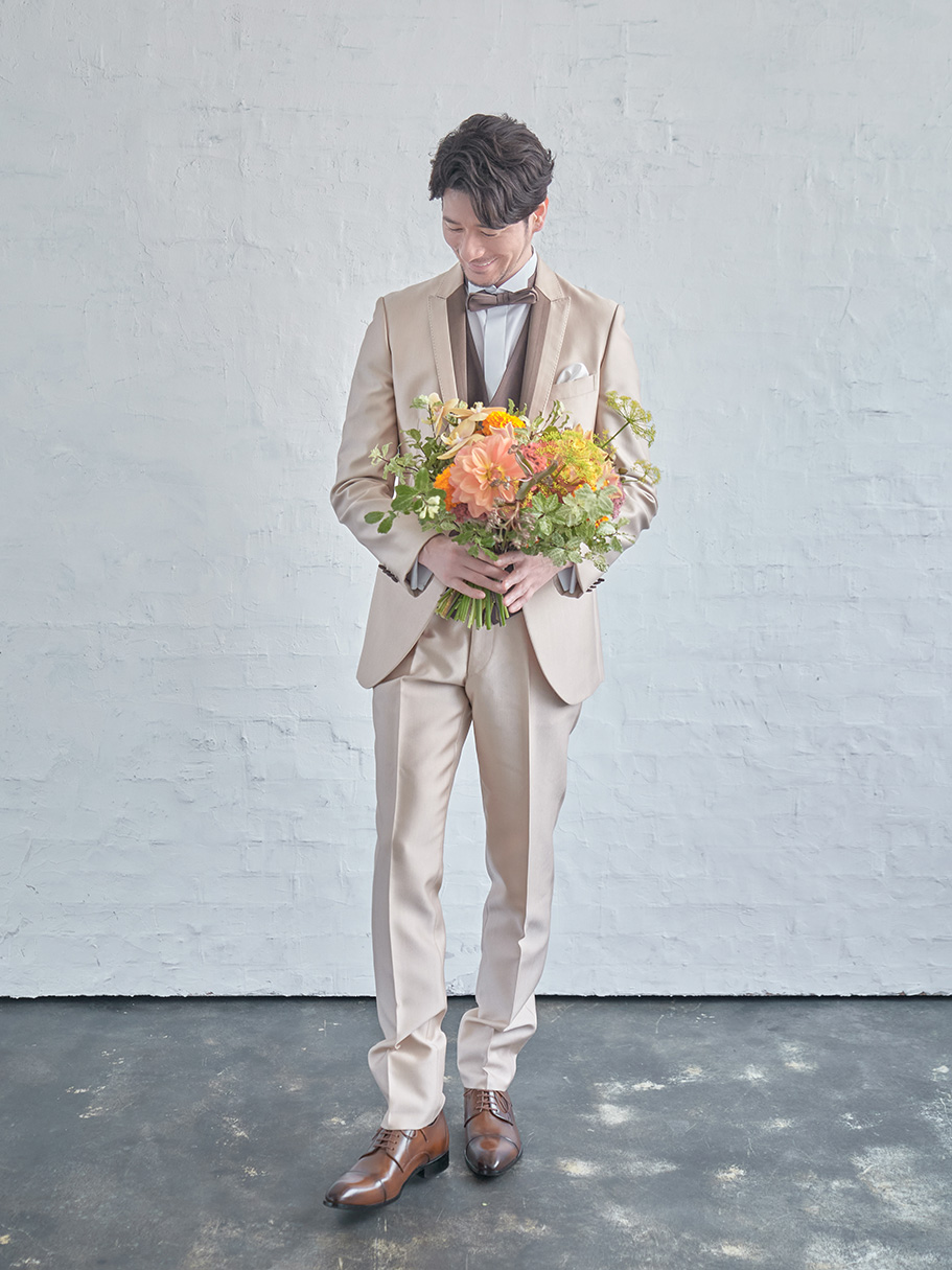 柔らかい印象のベージュに光沢感を加え華やかさが感じられるタキシード。