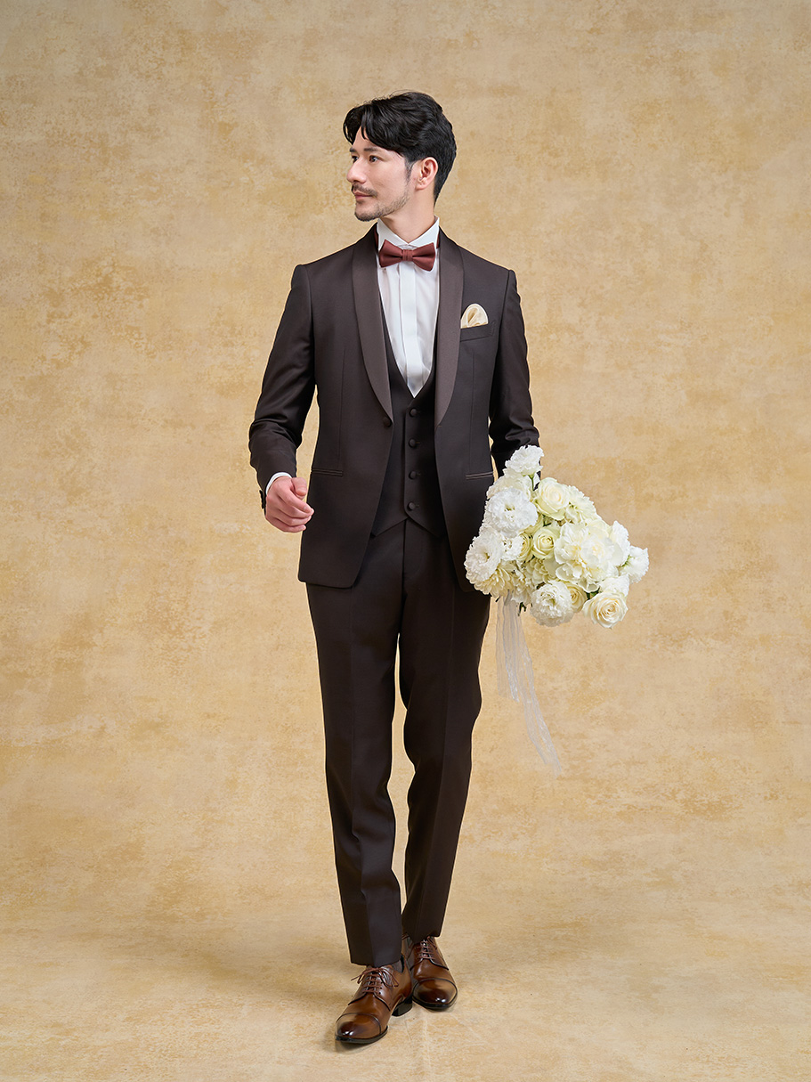 ブラウンの深い色味とショールカラーの光沢感とが織りなすコントラストは