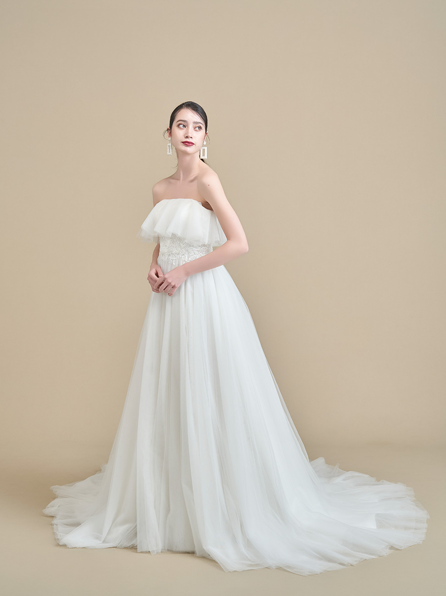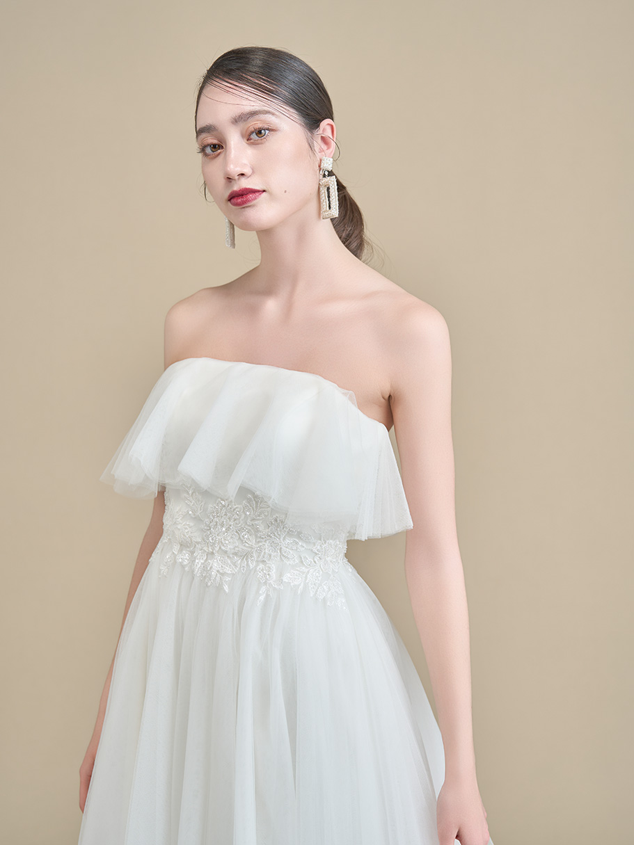 胸元のティアードチュールとインポートビジューが輝く