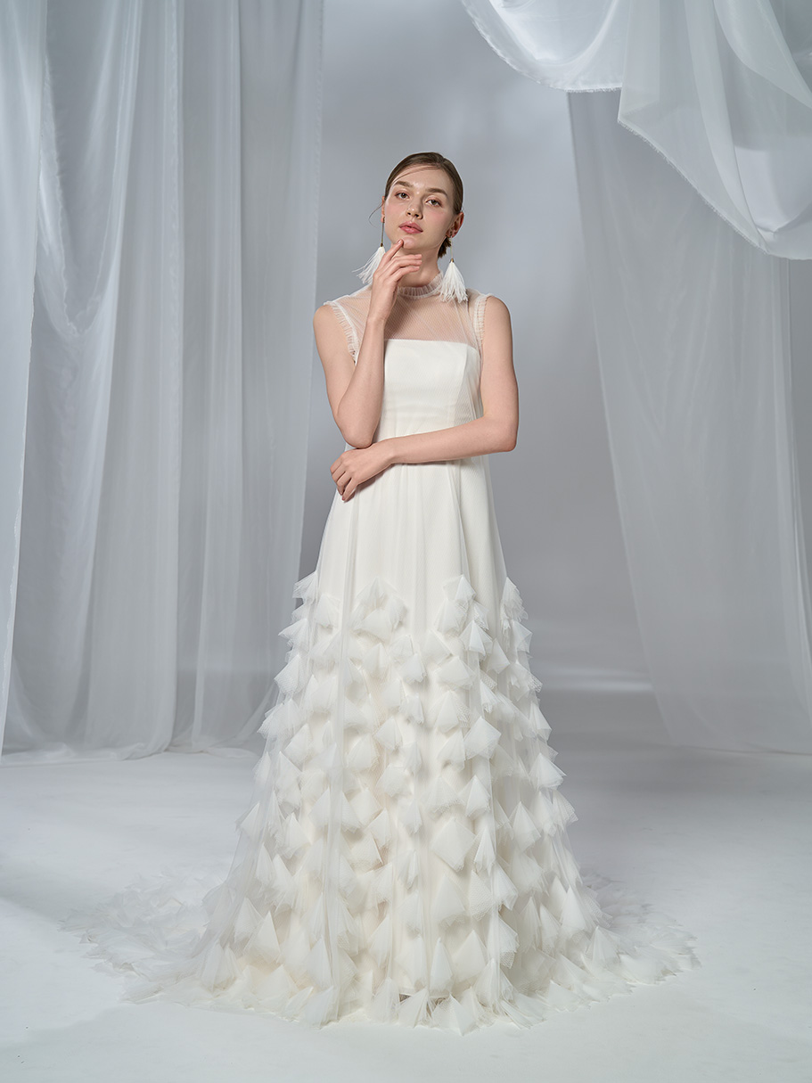 スカートのつまみ飾りが優しく揺れるクチュール感漂う一着。