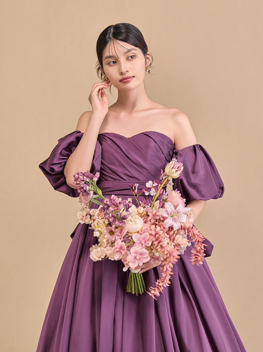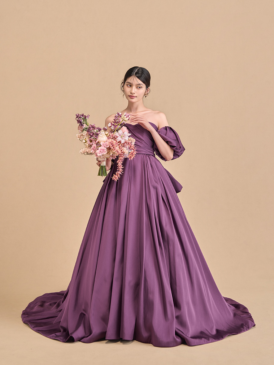 柔らかで滑らかなソフトミカド素材を使用した深みのあるパープルが美しいカラードレス。