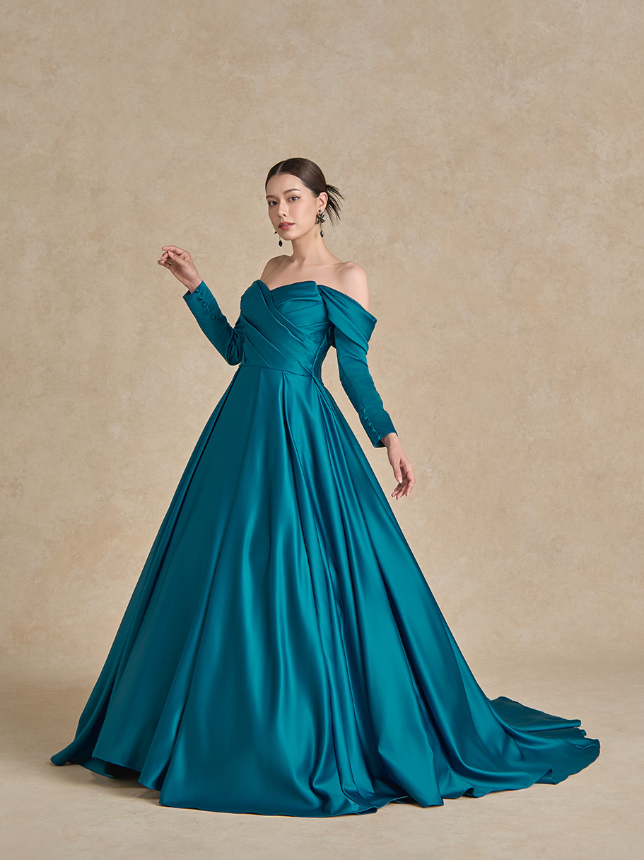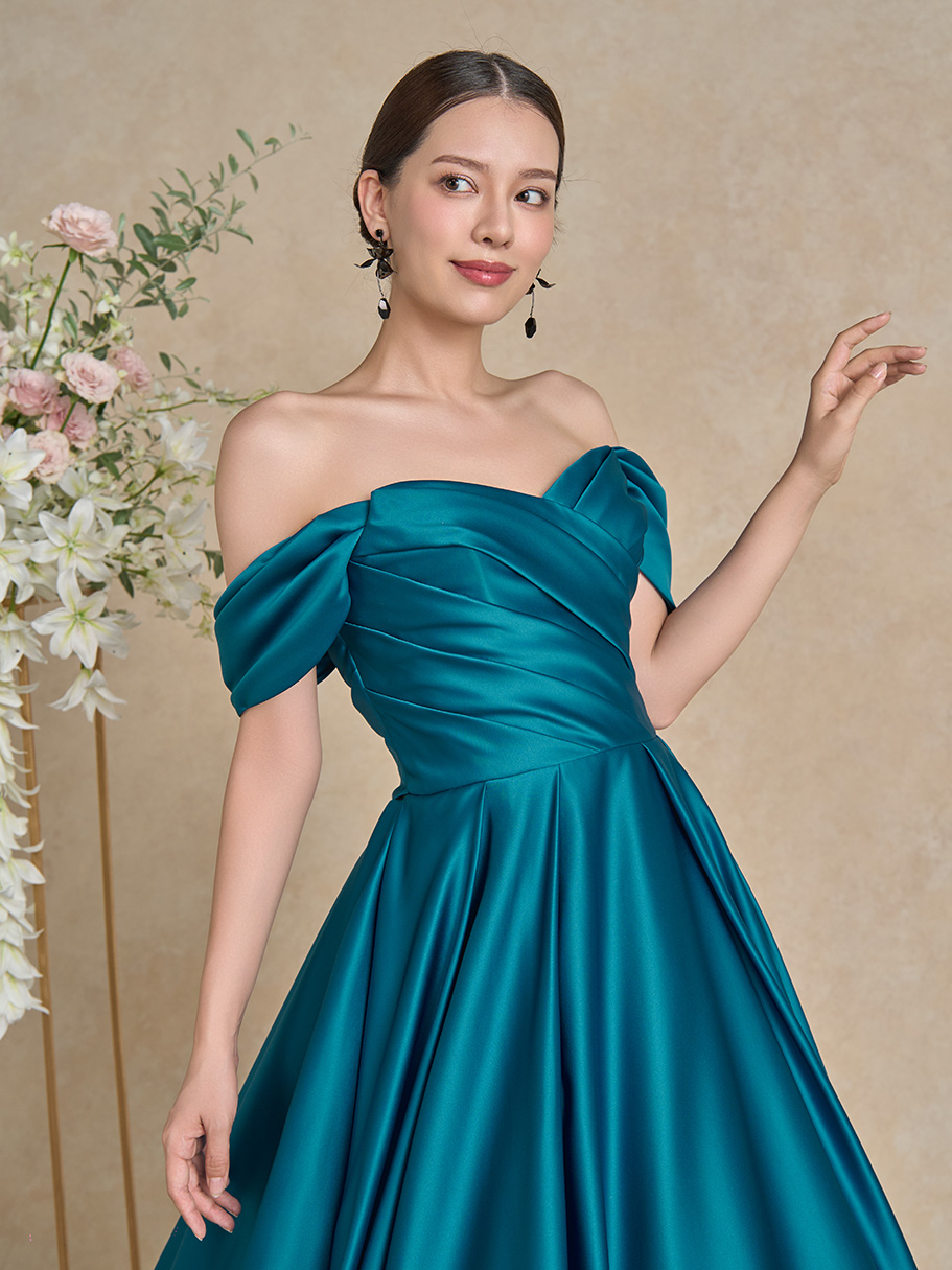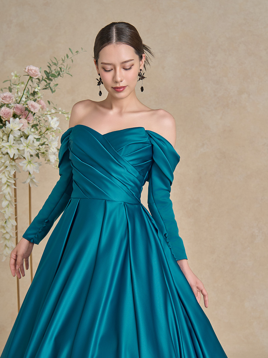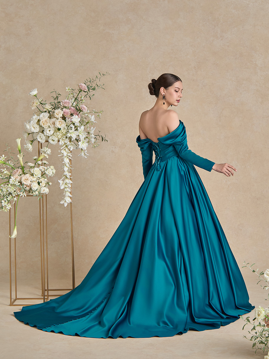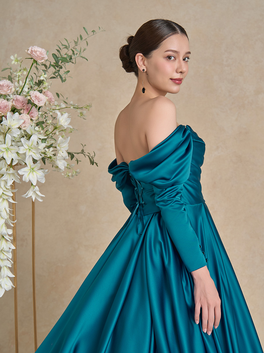 サテンならではの光沢感が作り出す、タックやドレープの陰影。