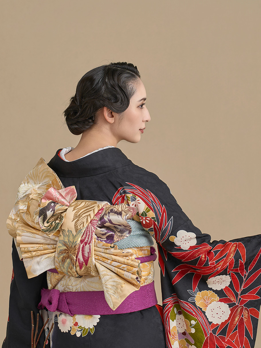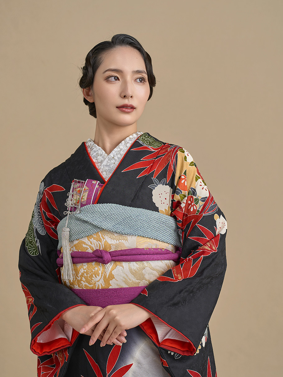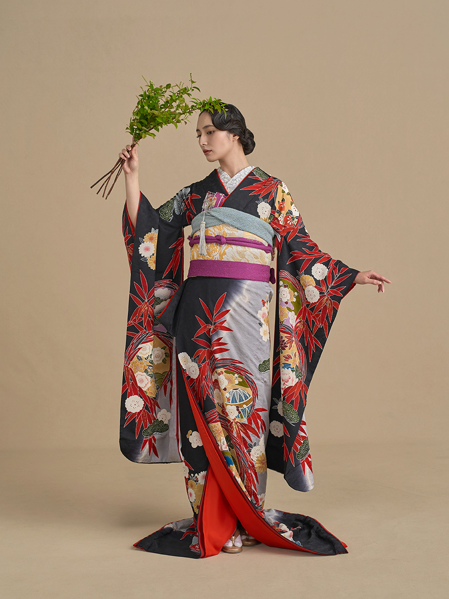 黒地に色鮮やかな四季の花々と笹の葉を描いた引き振袖。