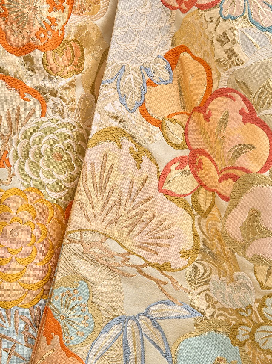 松竹梅と菊を横糸のみで細かく織り上げ、