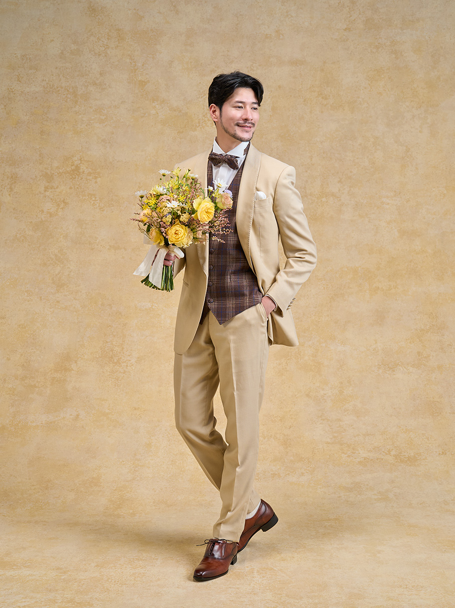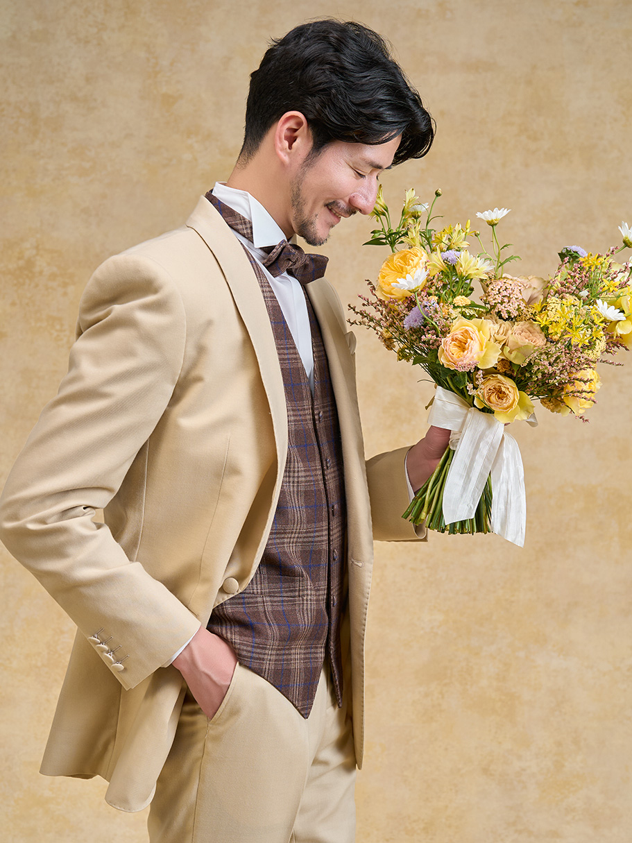 マットなライトベージュのカラーが、優しい印象を与える一着。