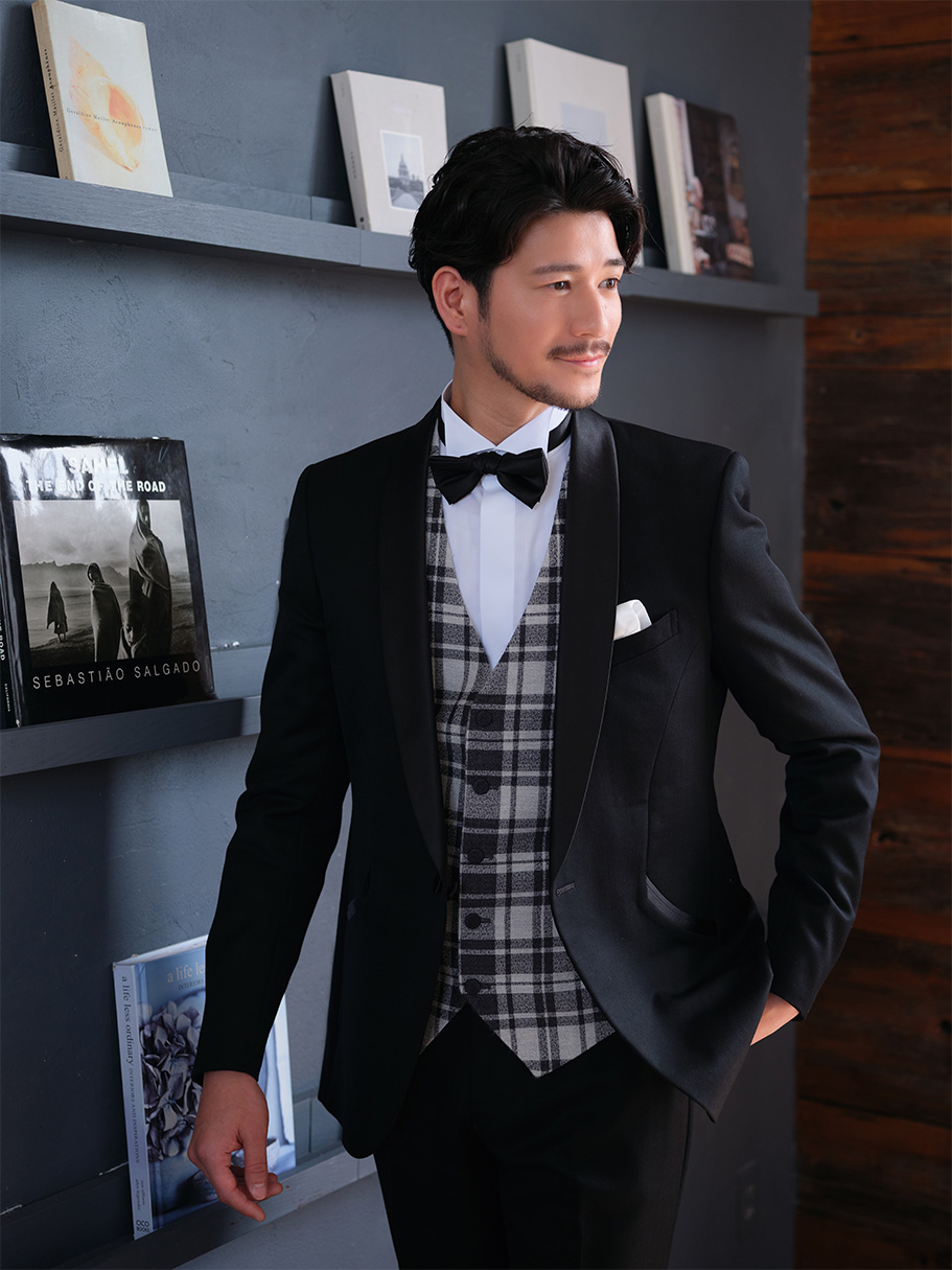 シンプルな黒のタキシードにチェックのベストを合わせた1着。
