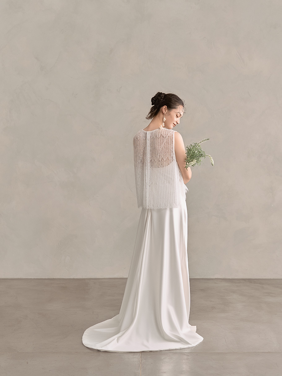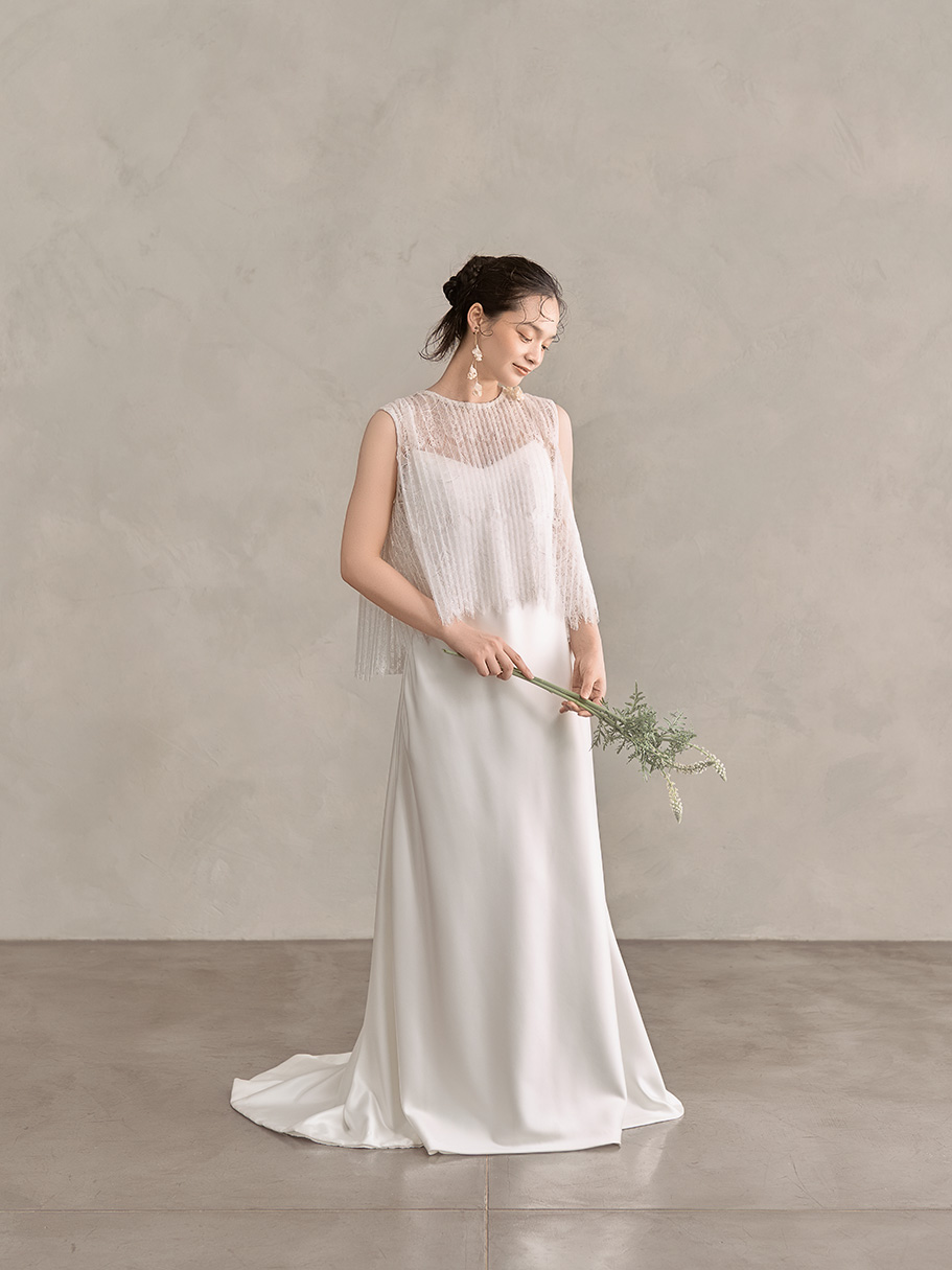 タックプリーツをあしらった繊細なレースのボレロが主役のドレス。