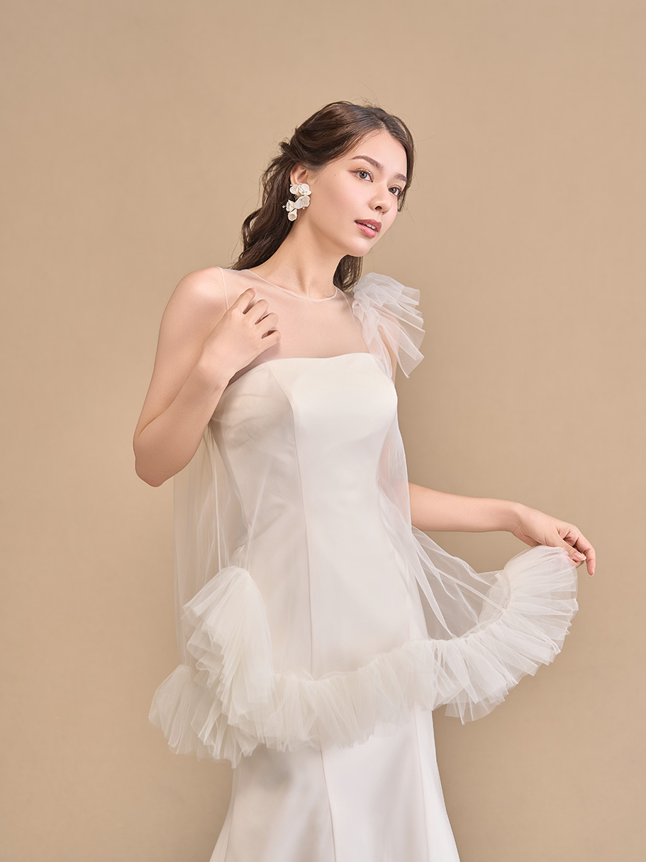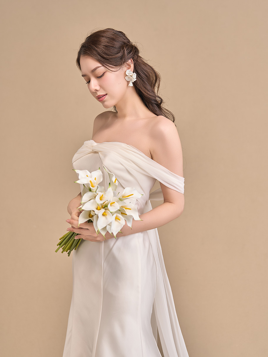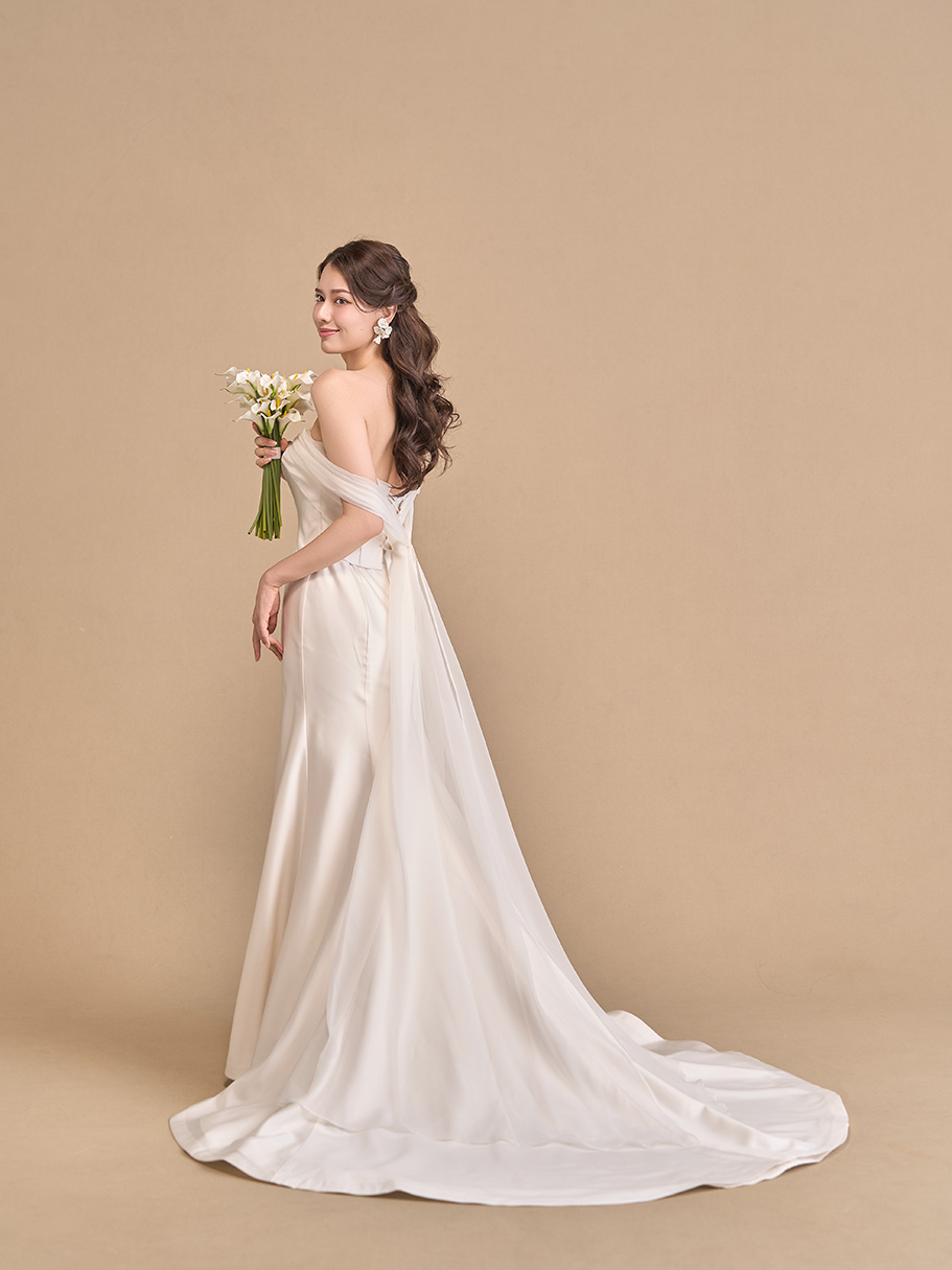 シンプルなソフトマーメイドラインに、流れるようなトレーンが優雅に揺れるドレス。