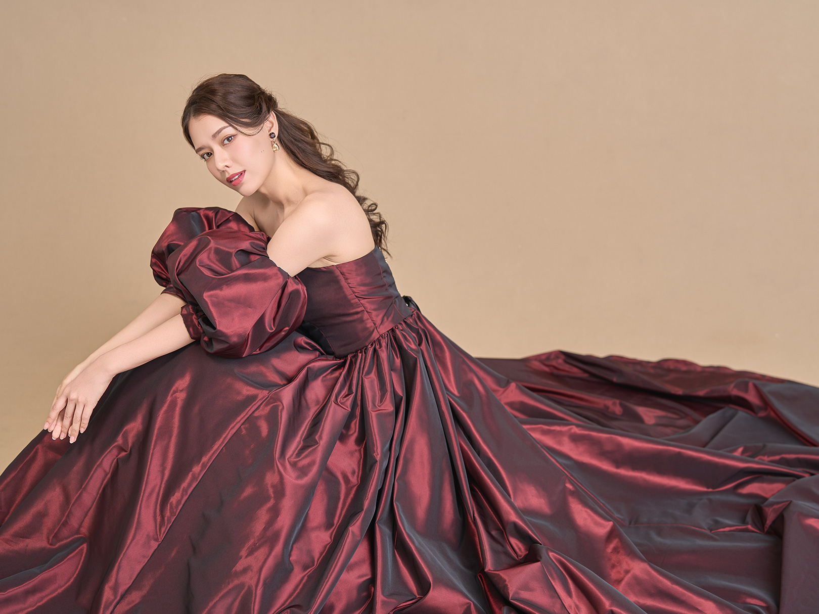 深みのある艶やかなワインレッドが印象的なドレス。