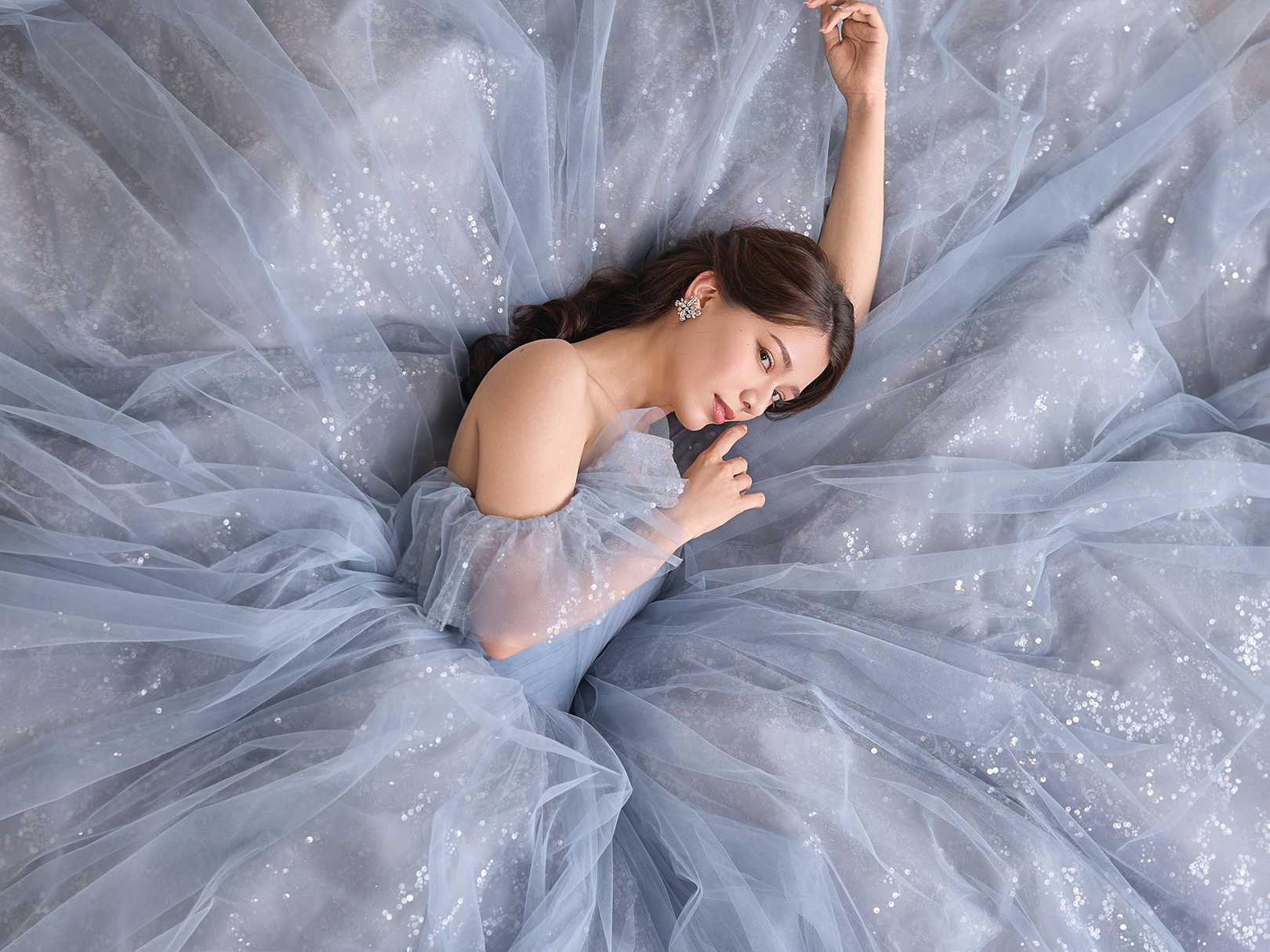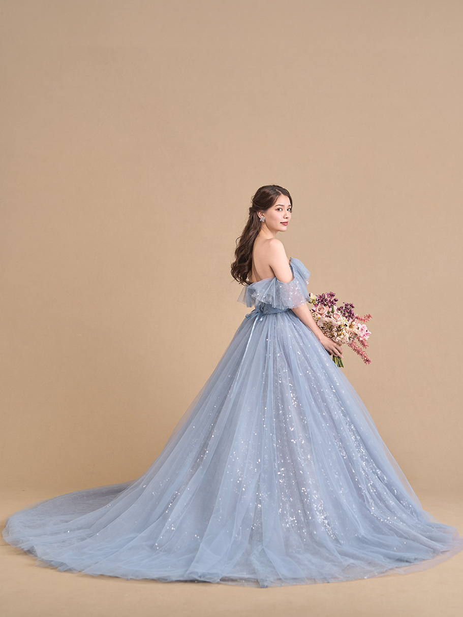 水色のチュールにグレイッシュな色味を重ねて仕上げたボリュームドレス。