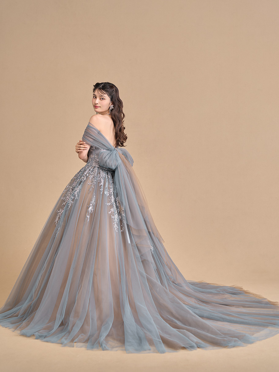 色味の異なるチュールを重ね、グリッターで煌きを添えた華やかな一着。