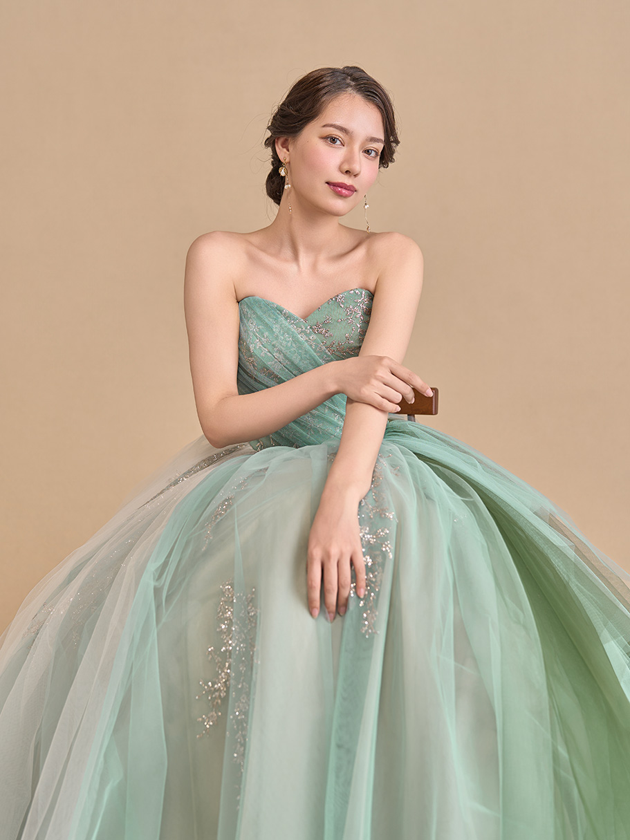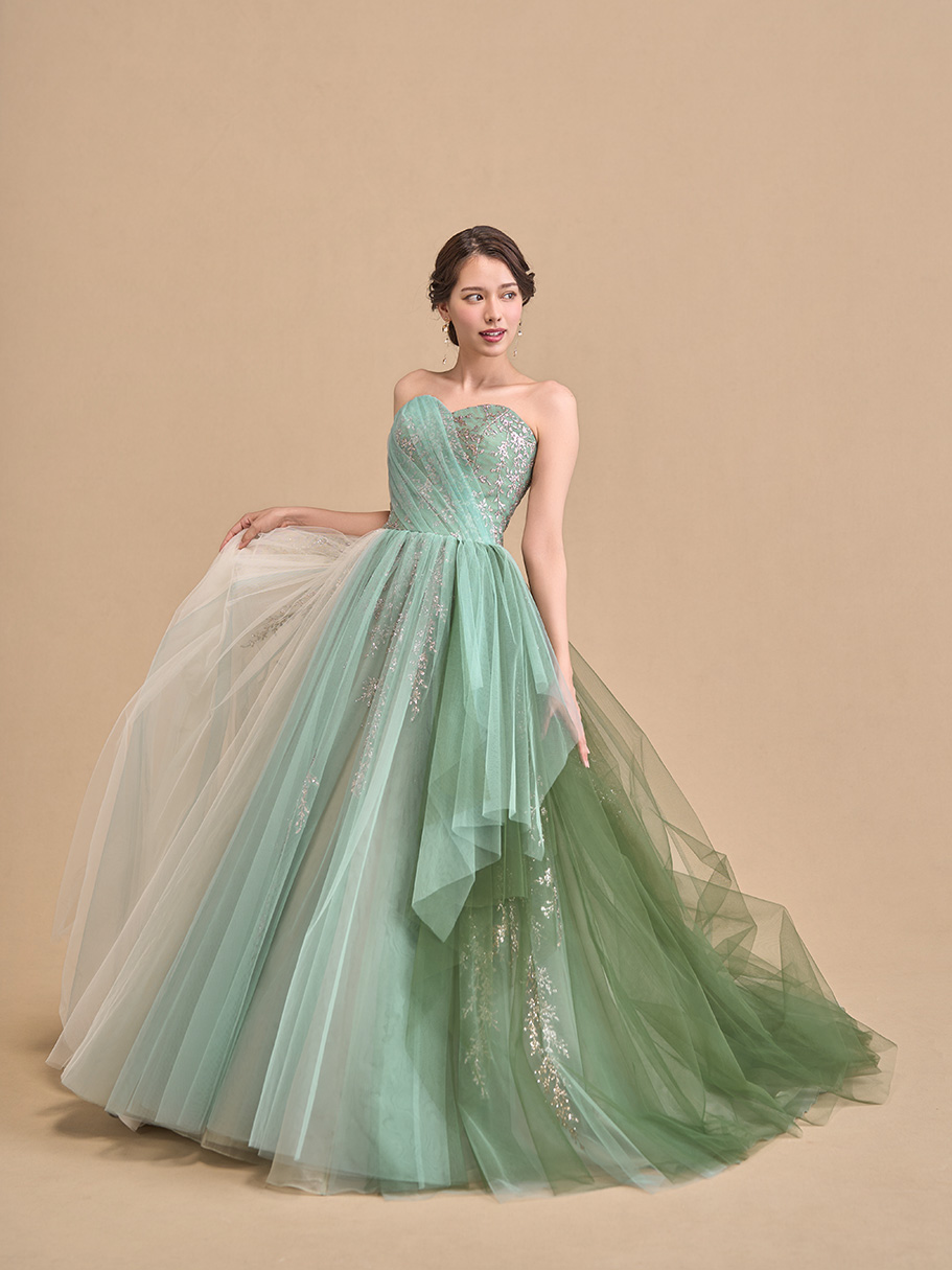 軽やかなチュールを幾重にも重ねたグラデーションが美しいドレス。