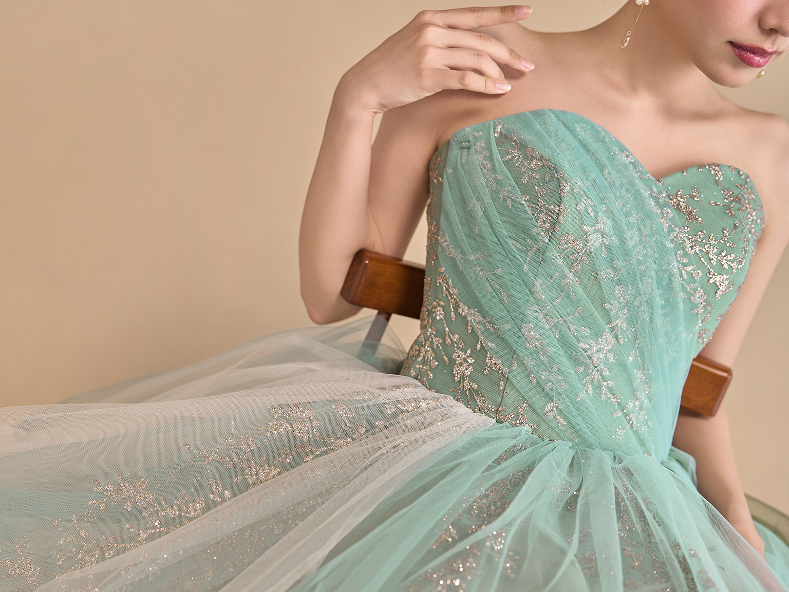 スカートのタッキングが透明感と奥行きを演出し、小花柄のグリッターを