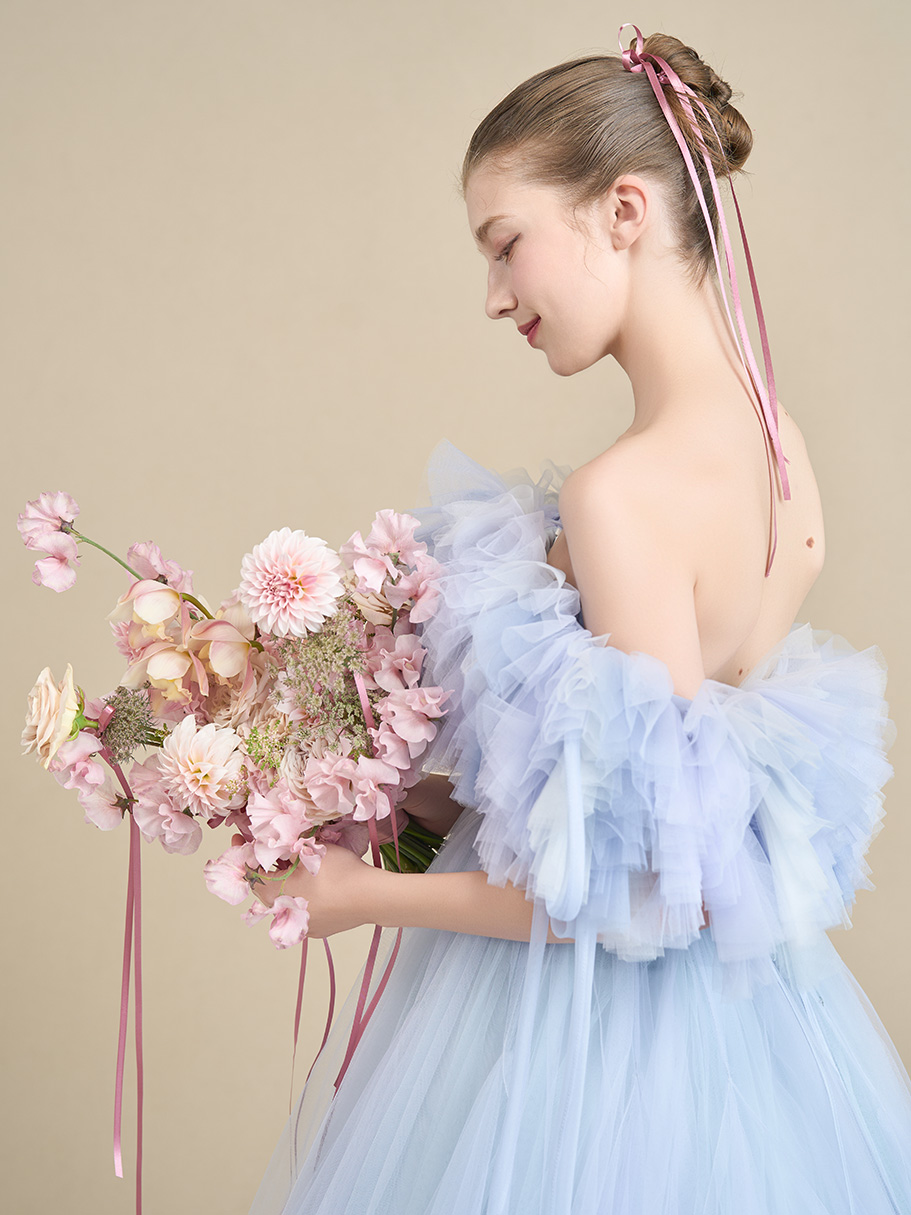 柔らかなチュールで仕上げたフリルショールは包まれるような心地良さ。