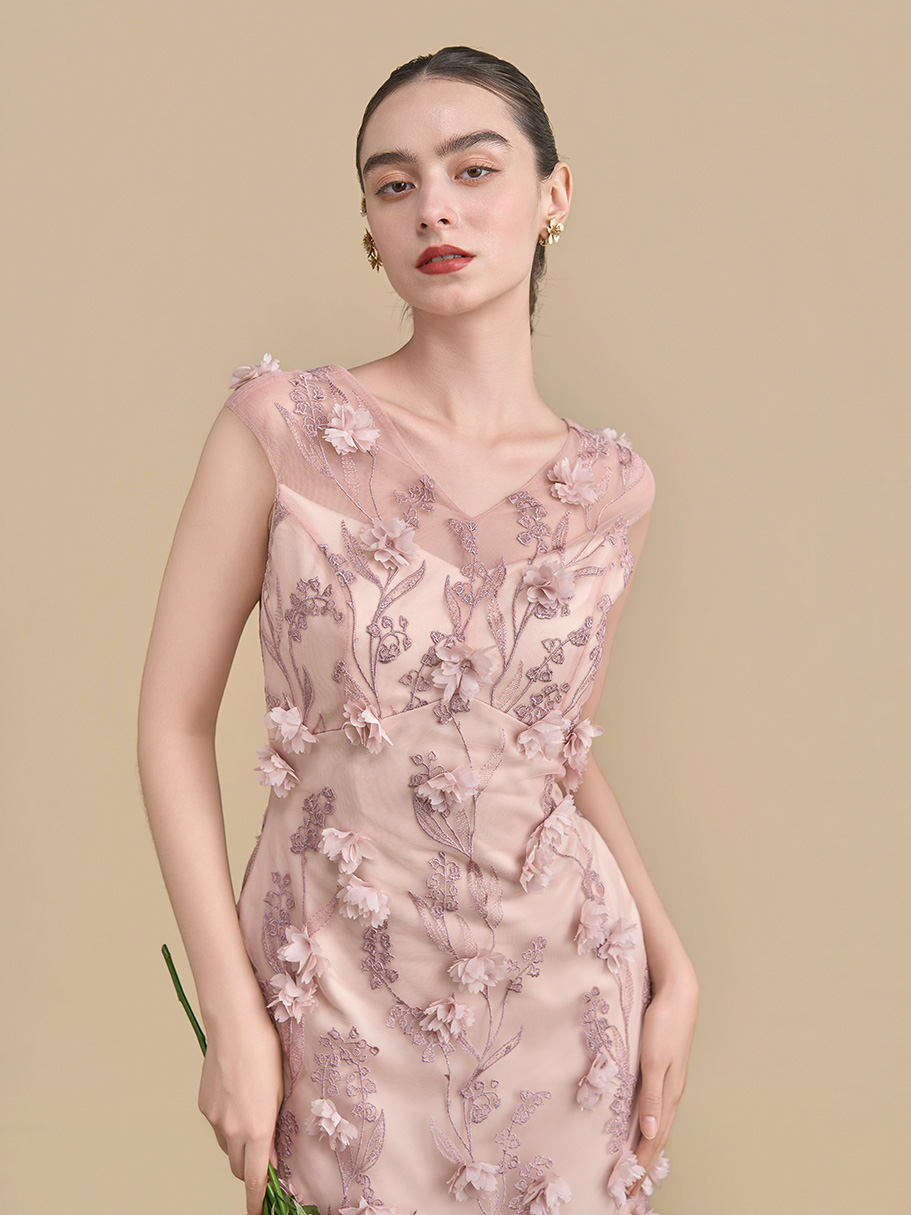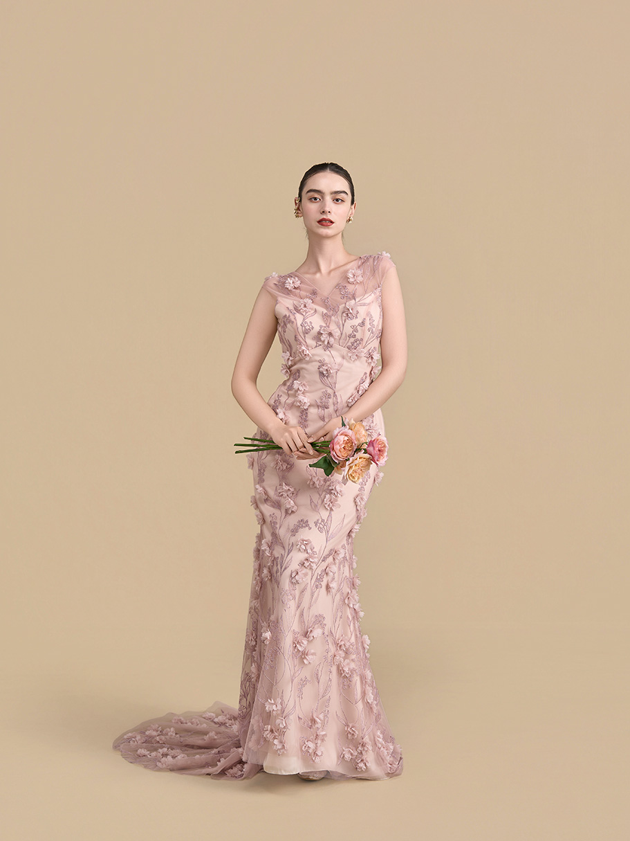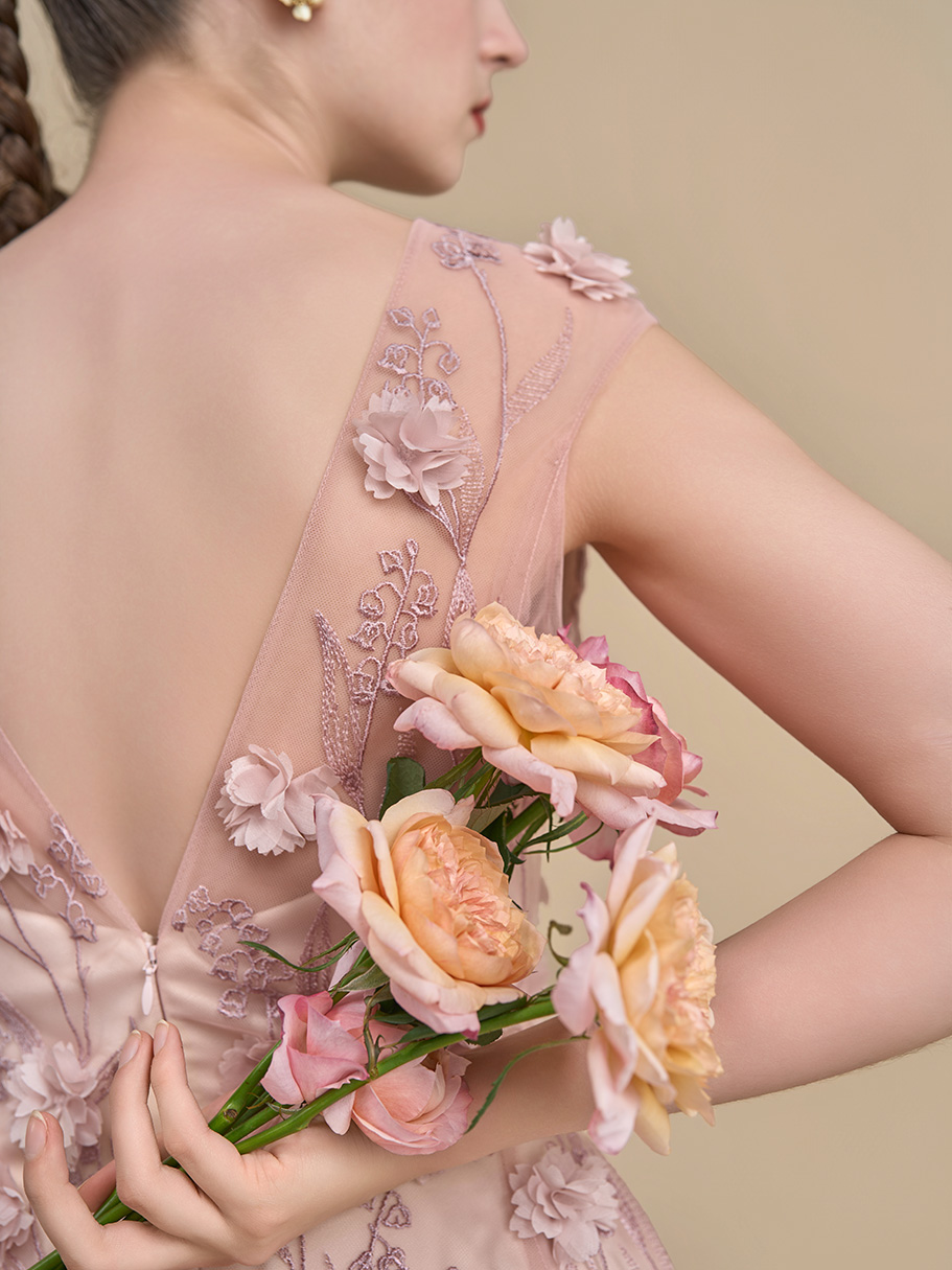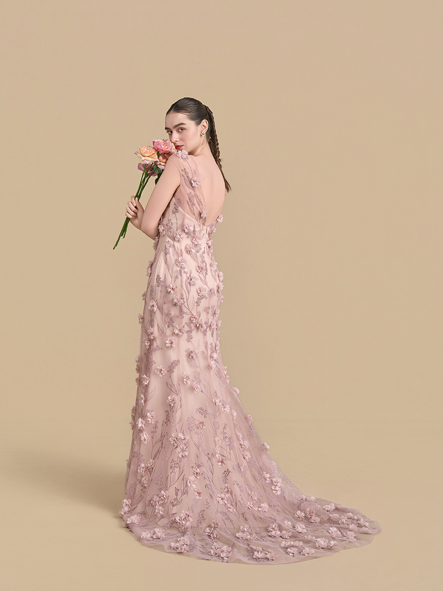 サテンの光沢に浮かび上がるピンクの総刺繍で艶めく美しさを纏って。