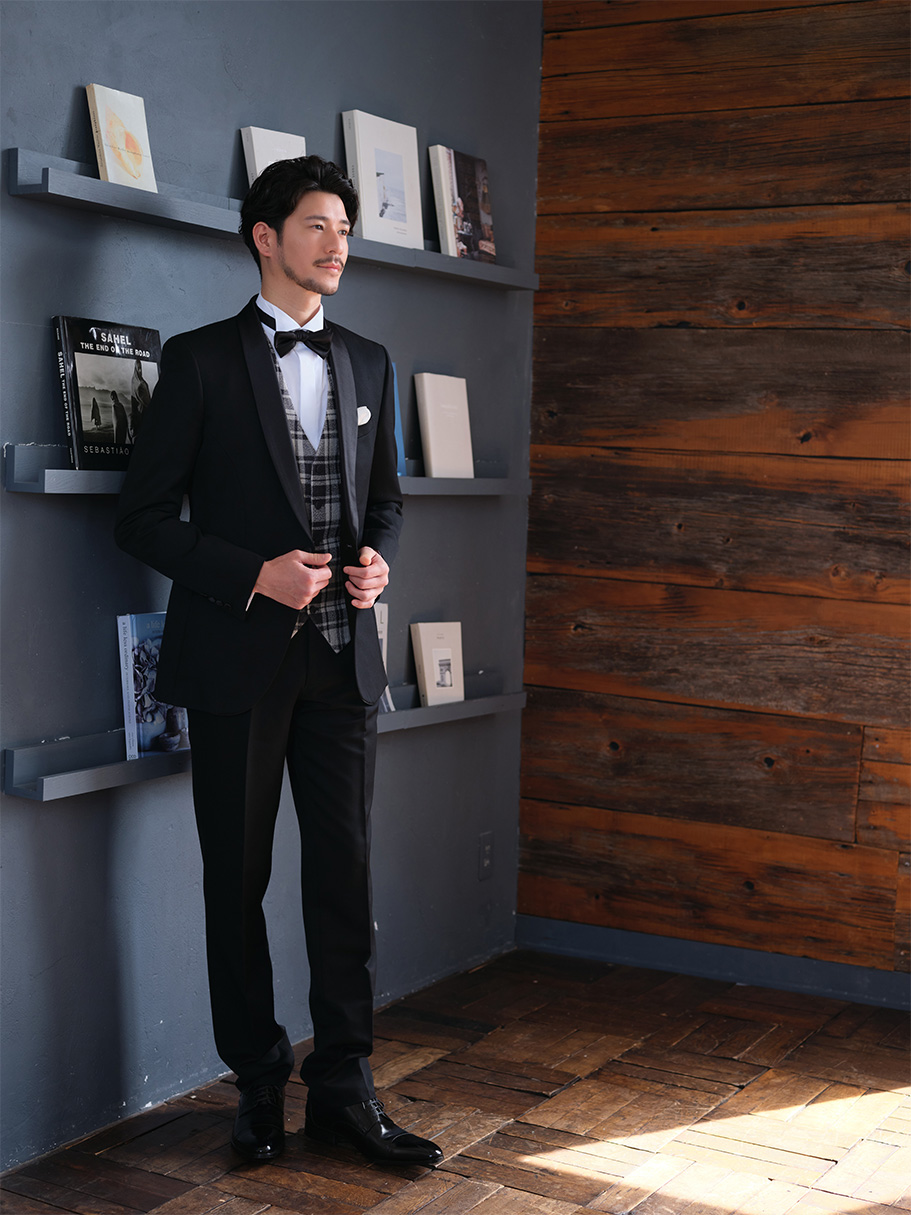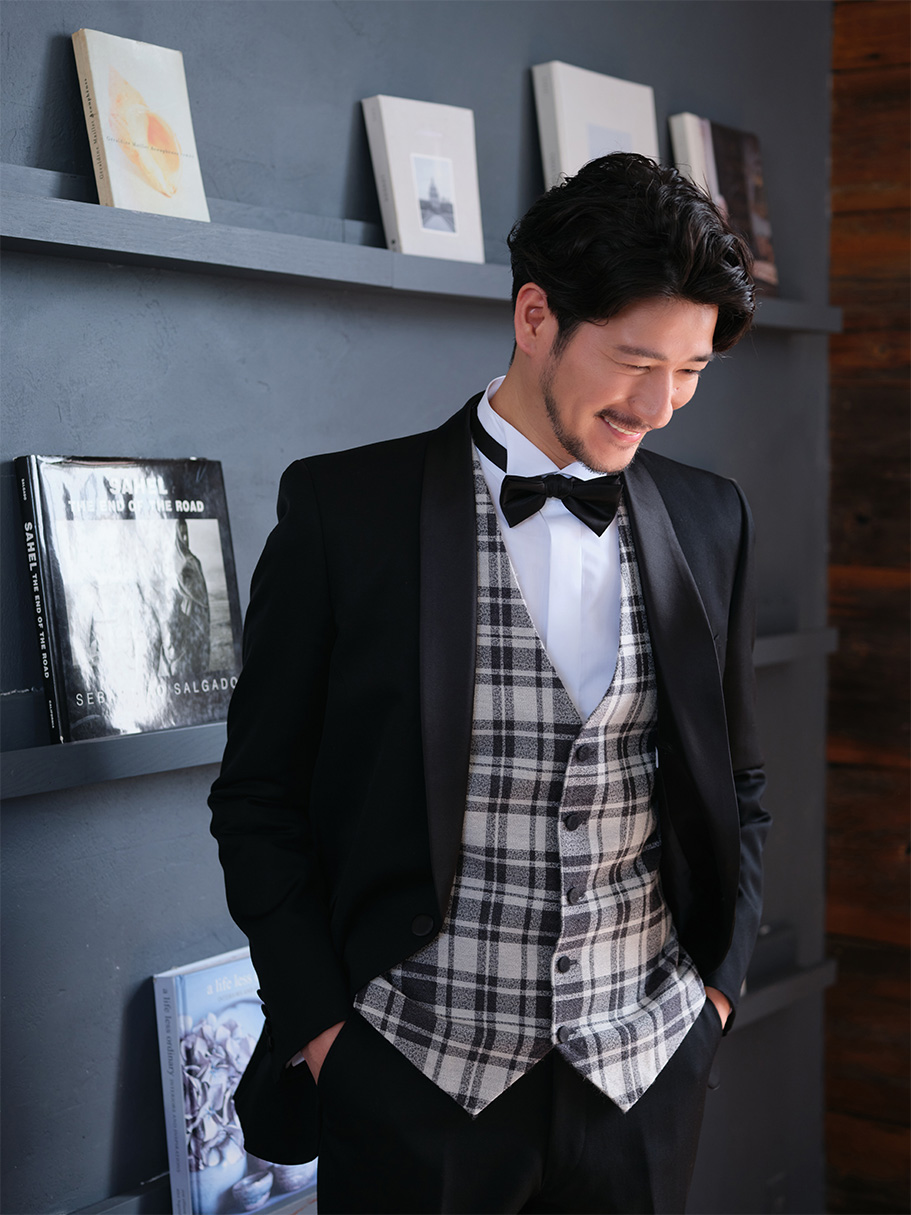 シンプルな黒のタキシードにチェックのベストを合わせた1着。