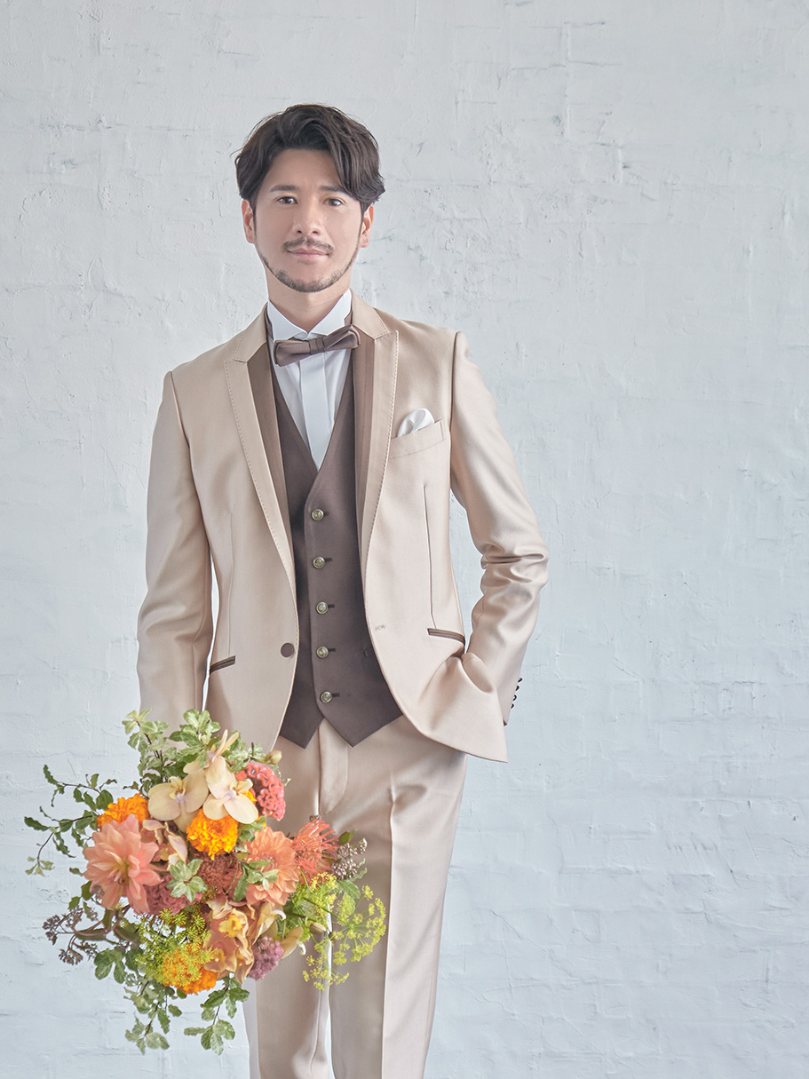 柔らかい印象のベージュに光沢感を加え華やかさが感じられるタキシード。