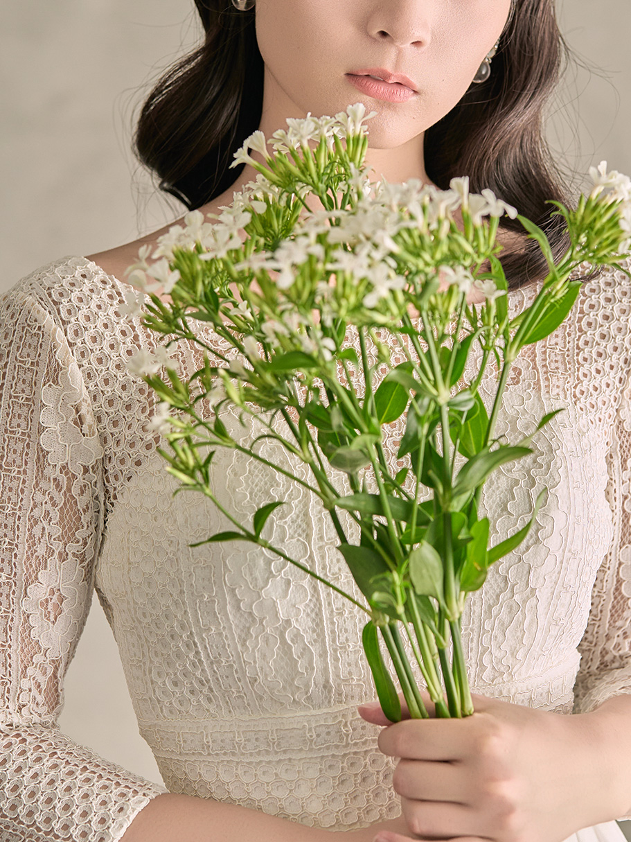 幾何学模様のレースが織りなす美しい陰影に、レトロシックなムードが漂うドレス。