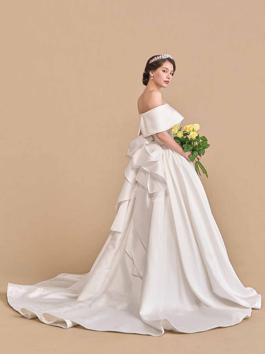優雅に広がるスカートにはフランス製コードリバーレースを配して。