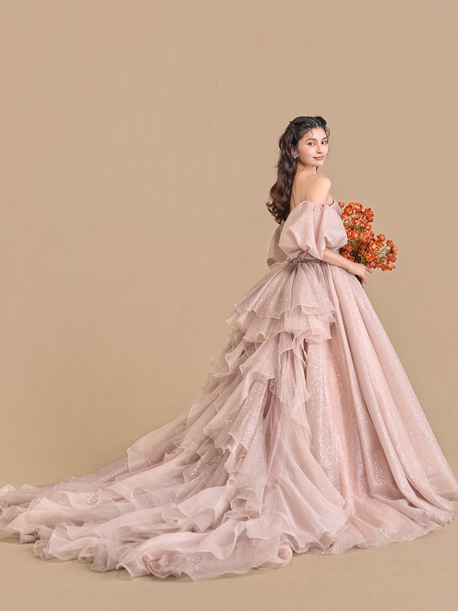 全体に施されたグリッターが煌めきを放つ、ピンクベージュのドレス。