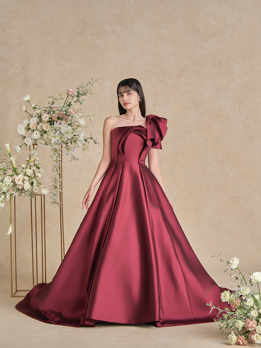 立体感なトップスにリボンモチーフのワンショルダーが