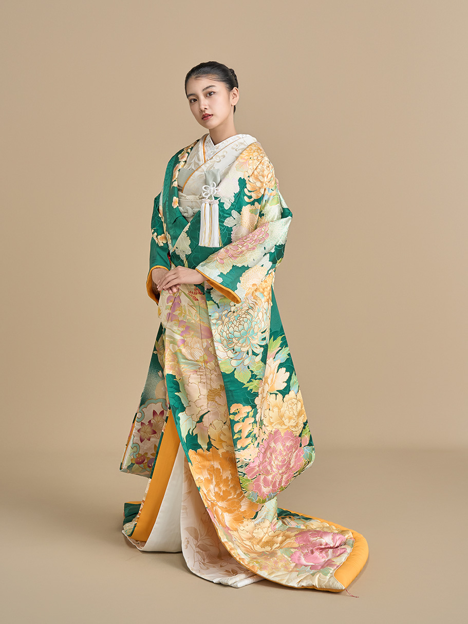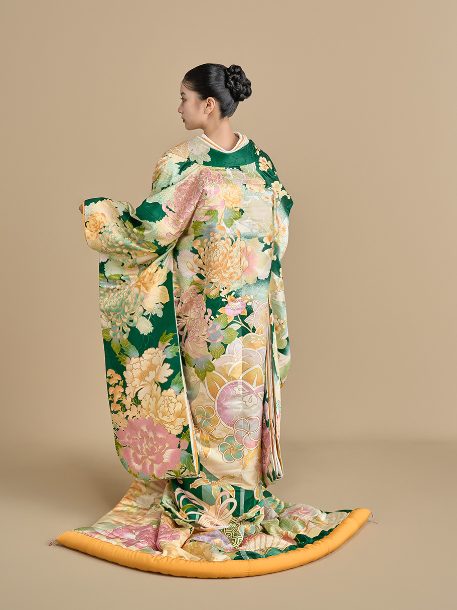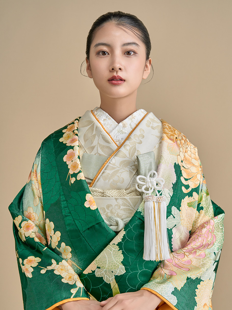 瑞々しい華やかな緑色が写真にも映える一着です。