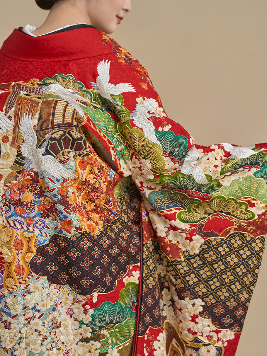 友禅に手刺繍を重ね、桜の花房が香るような優美さで佳き日を彩ります。