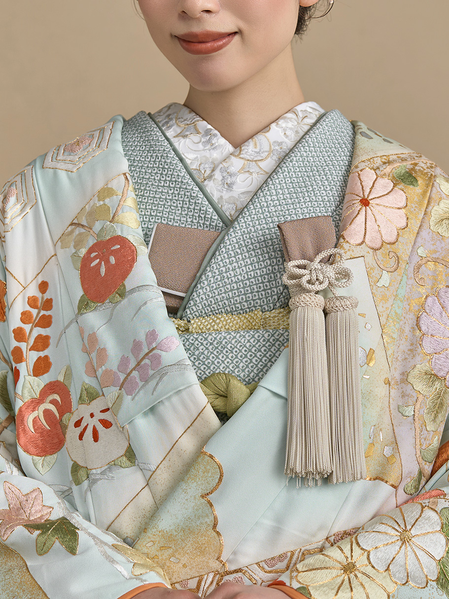 正絹駒無地を優しい薄水色に染め上げ、手刺繍と金駒刺繍に金箔を重ねて豪華さを表現した衣裳。
