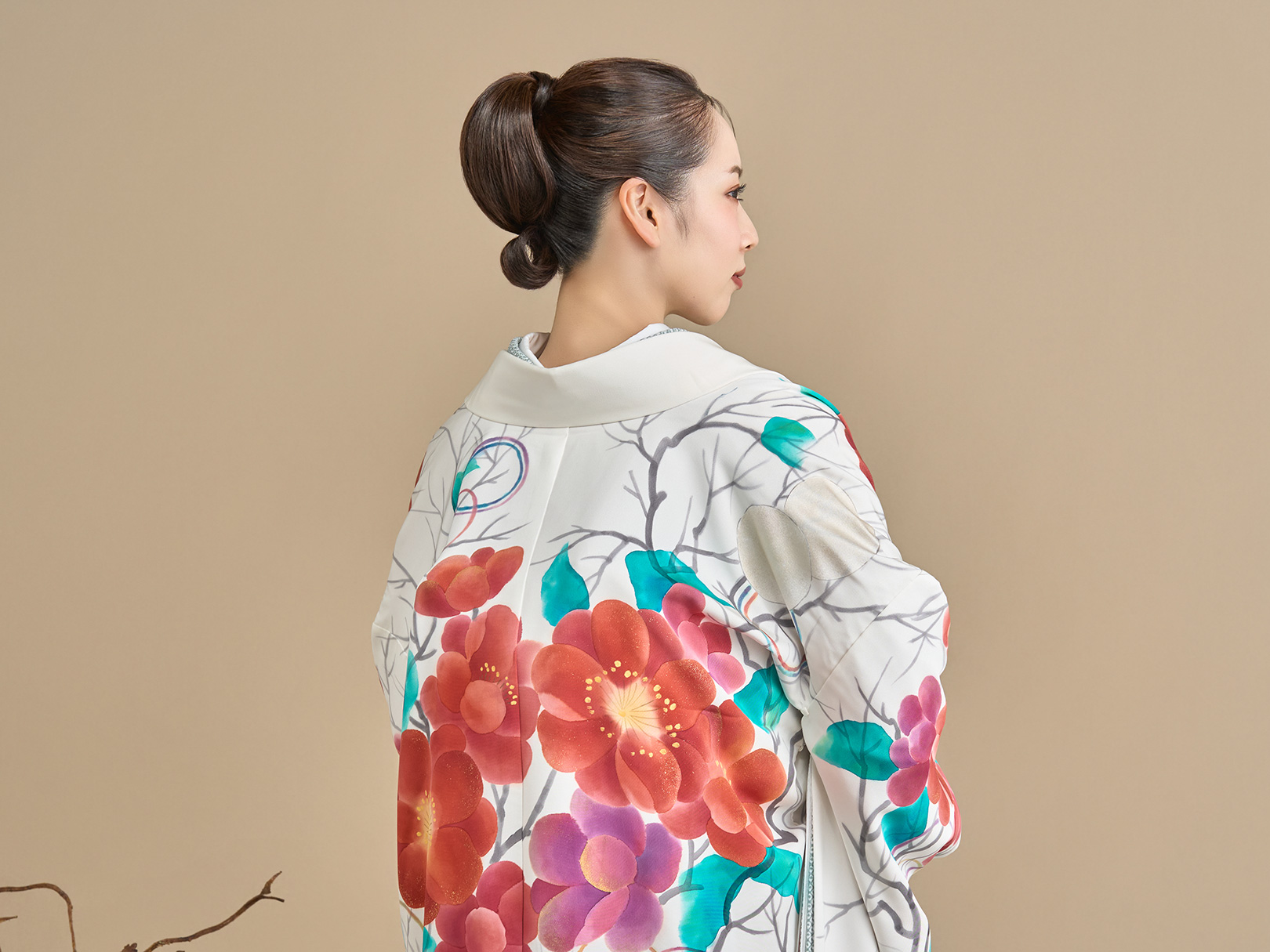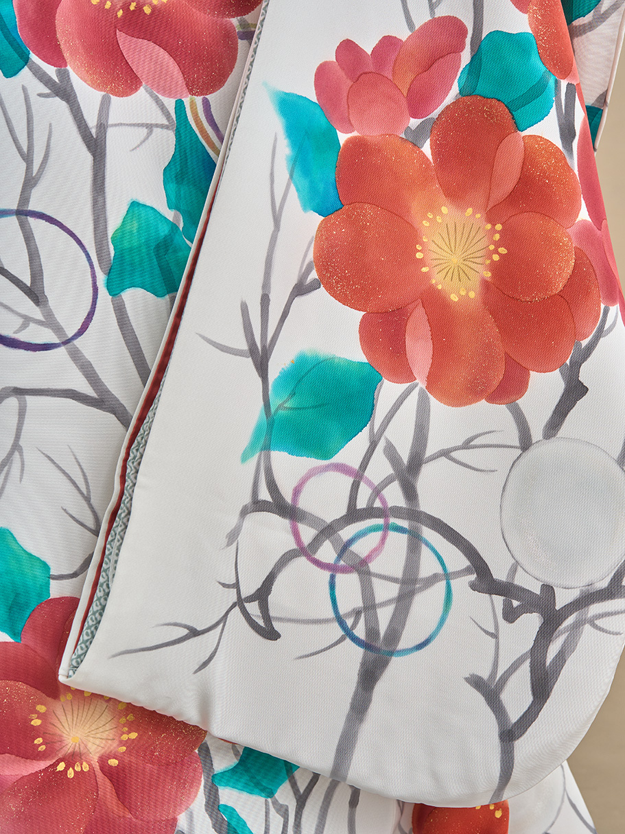 白の正絹織物地に、色鮮やかな梅が咲き誇る手描き友禅。